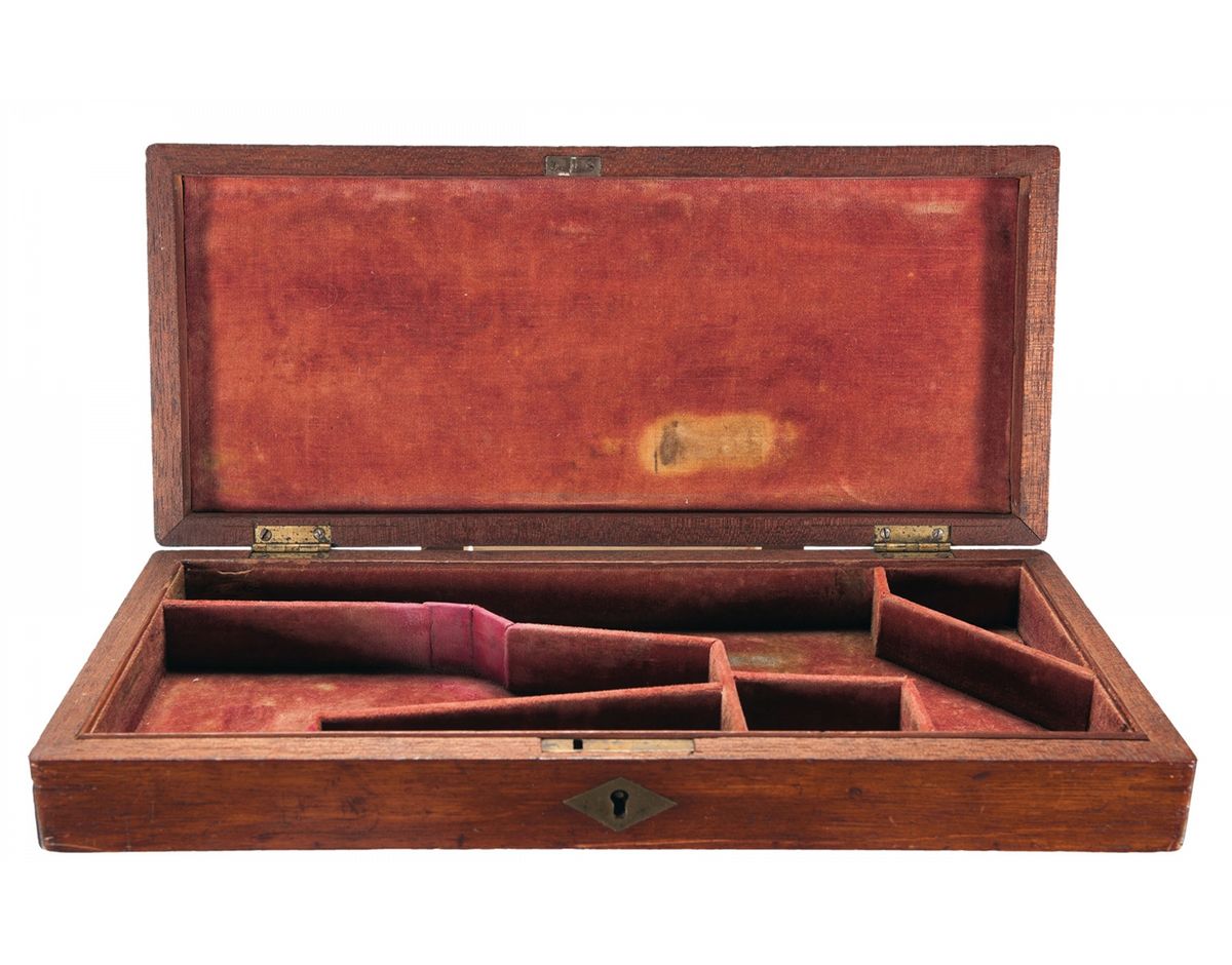 Measuring 14 1/2 inches wide, 6 1/4 inches deep and 2 inches tall, this mahogany case is configured for a Colt Model 1851 Navy revolver. The exterior is unmarked, with a brass diamond lock escutcheon on the front and concealed hinges. American-style interior, with red felt lining and 5 internal compartments, spaces for the revolver, cap tin, bullet mold, flask and bullets.