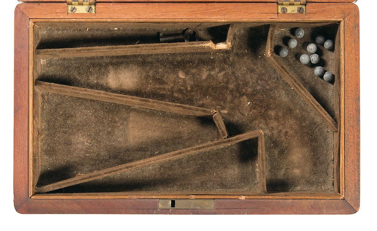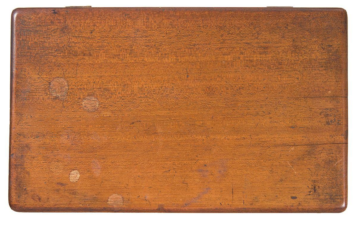 American case with brass hardware and brown velvet lining, padded in the lid. The interior has five compartments and a key is supplied for the lock. Possibly for Colt Root percussion or something similar. Fair.
