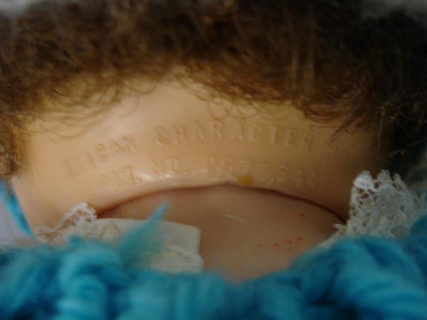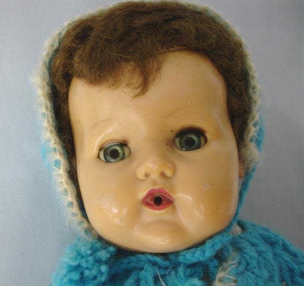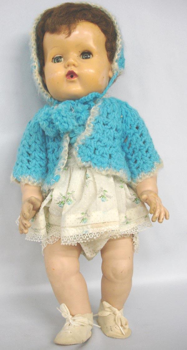 American Character Doll, Baby w/Sleep Eyes, Bottle Opening in Mouth. The eyes have eyelashes, but most of right lashes are missing and the eyes don't work. Hard rubber body, cloth dress and crocheted jacket. American Character Doll, Pat. 2,675,344 is on back. Needs cleaning. Measures 18''. SHI $25.