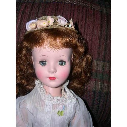 This is a doll from 1953. She is 17" tall and is a Sweet Sue by the American Character Doll Corp. She has a hard plastic head wtih rooted hair. She has vinyl arms that are jointed. She is a walker that works but being a walker her head moves quite a bit. Seh as pretty pink knee blush. She is all original including her pink wrist tag that says Sweet Sue queen of Dolls. She has a straw hat with flowers on it. If her legs are to bend at the knees they don't and I don't want to try and force them. Her head is marked Amer Char Doll. Her hair is flat from laying in a drawer. She has a taffeta slip with blue net trim and taffeta panties. She has white rayon socks with the blue band trim and she has side snap blue fuzzy shoes.Her one eyelash was curled alittle so I pushed it up and now the eye opens all the way. She has great facial paint. The only thing I see that could use help, is the elastic is stretched out in the puff sleeves. You can just use the elastic thread and pull that together. I don't believe she was ever played with. I just moved her arm and at the elbow in the back on one arm there is some pink marking. Not sure what that is from. There are 4 little marks but depending on how you move the arm, you could just see on but it's on the underside of the arm. If you can love her, please bid. She is from a smoke free environment. Buyer to pay $20 for U.S. shipping, insurance, and handling. Thanks for viewing.