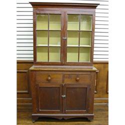 In two sections; the interior of top section painted mustard-yellow. Bottom section lacking one return molding on top; casters added.