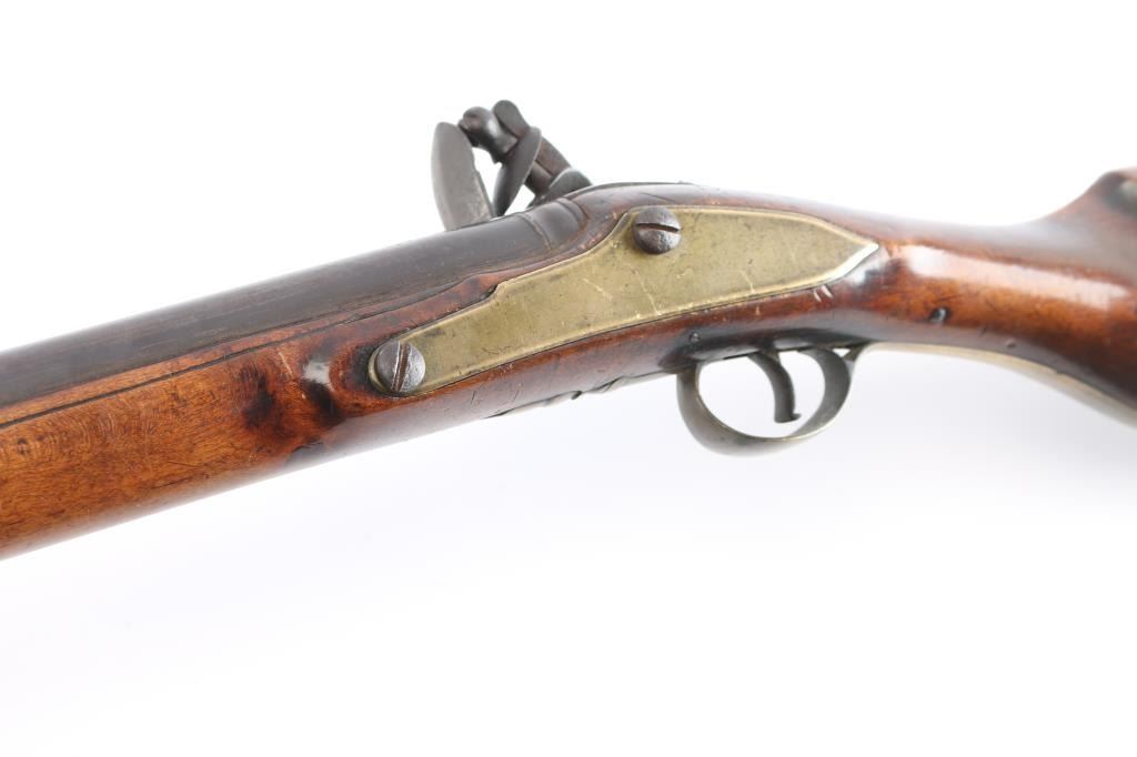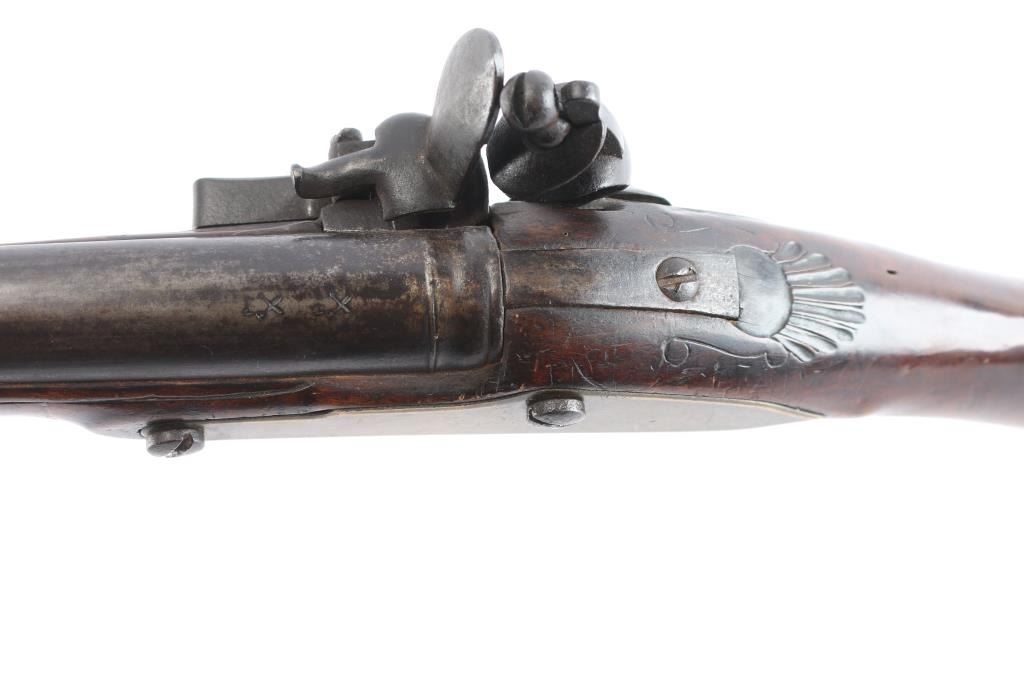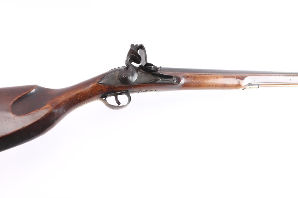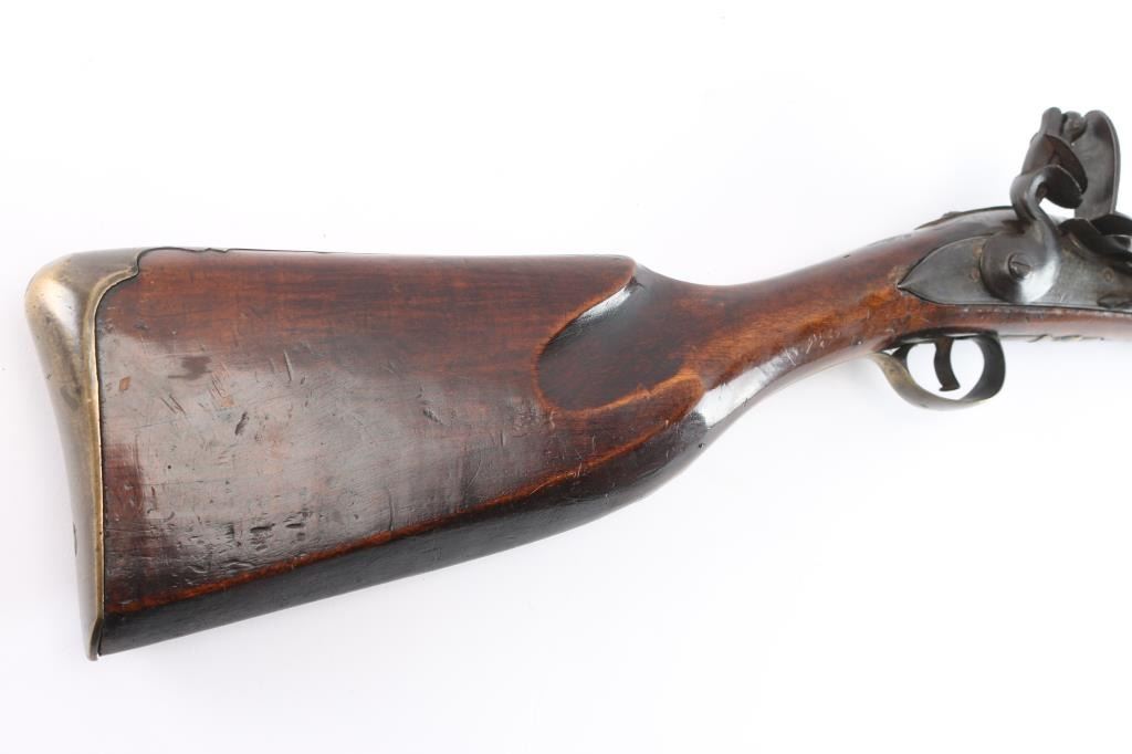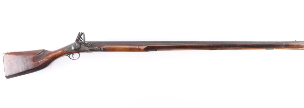 With lock scroll engraved, "Ketland & Co. (circa 1750 approximately). Measures 42" 75 cal bbl showing crossed key and crown proof. Plain grain American walnut stock with paddle or "club butt" and plain brass mounts. Incised shell carving at back of tang. Metal surfaces are very good with matching dark brown to black patina along with fairly smooth metal showing slight pitting mainly at firing areas. The wood is very good plus with minor chips and small losses around the look but exceptional overall. The frizzen was relined during use and the springs is weak. However, all original plus uncleaned. Mounts show a natural light honey colored patina. A classic American gun that could have been militia used or also as a sporting gun. A classic form. Note: Newman's Encyclopedia of the American Revolution illustrates identical butt plate on page 213. Ill# 25. Also similar club butts are illustrated page 125, Ill# 5&6, identified as Hudson Valley 1720-1750.