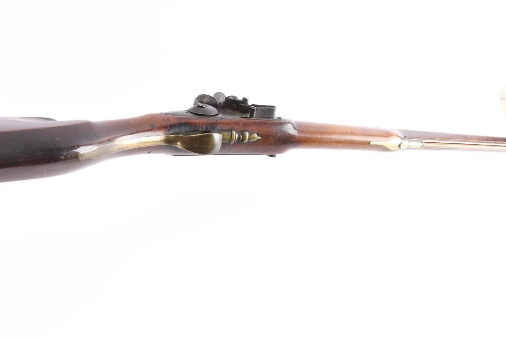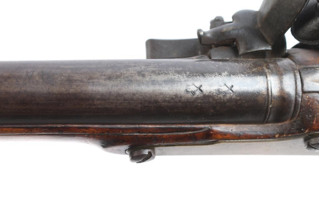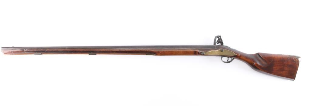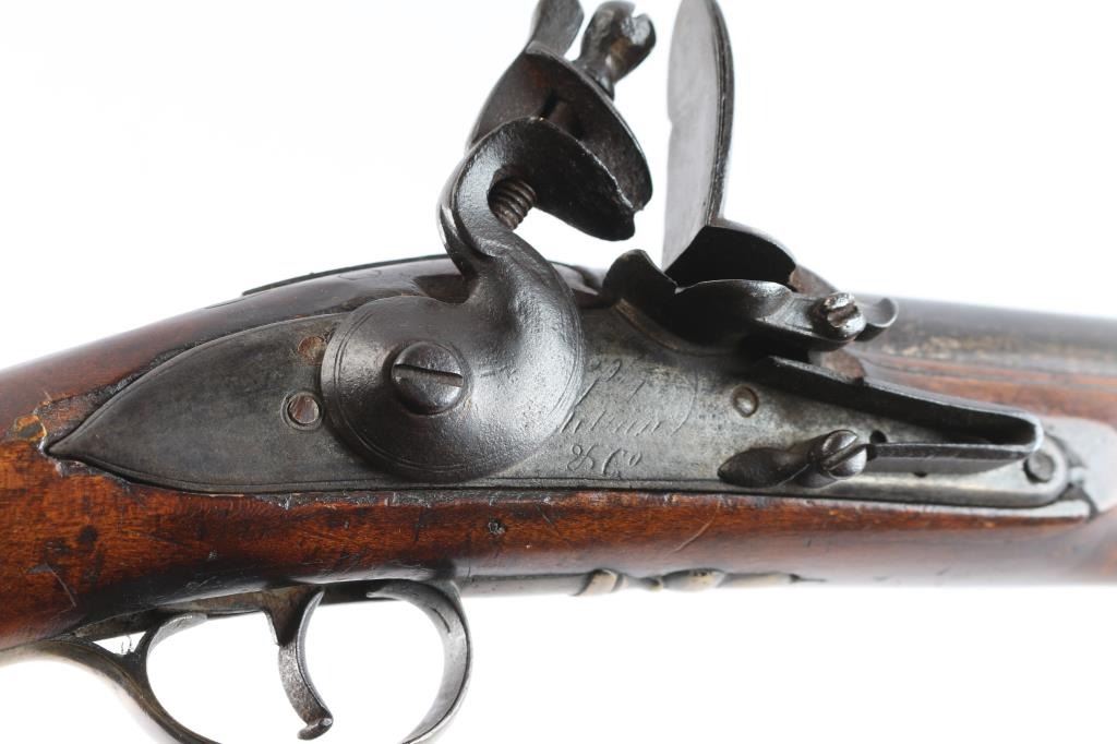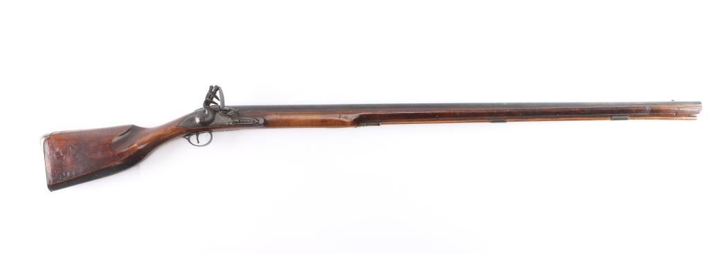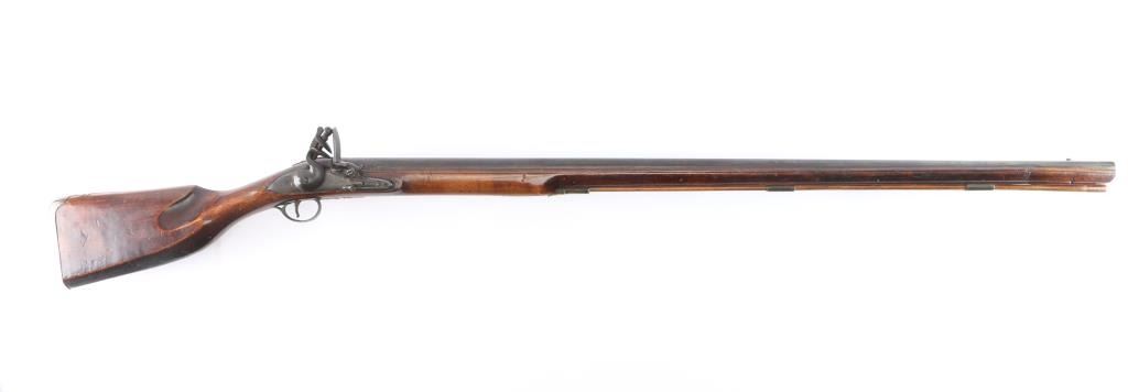 With lock scroll engraved, "Ketland & Co. (circa 1750 approximately). Measures 42" 75 cal bbl showing crossed key and crown proof. Plain grain American walnut stock with paddle or "club butt" and plain brass mounts. Incised shell carving at back of tang. Metal surfaces are very good with matching dark brown to black patina along with fairly smooth metal showing slight pitting mainly at firing areas. The wood is very good plus with minor chips and small losses around the look but exceptional overall. The frizzen was relined during use and the springs is weak. However, all original plus uncleaned. Mounts show a natural light honey colored patina. A classic American gun that could have been militia used or also as a sporting gun. A classic form. Note: Newman's Encyclopedia of the American Revolution illustrates identical butt plate on page 213. Ill# 25. Also similar club butts are illustrated page 125, Ill# 5&6, identified as Hudson Valley 1720-1750.