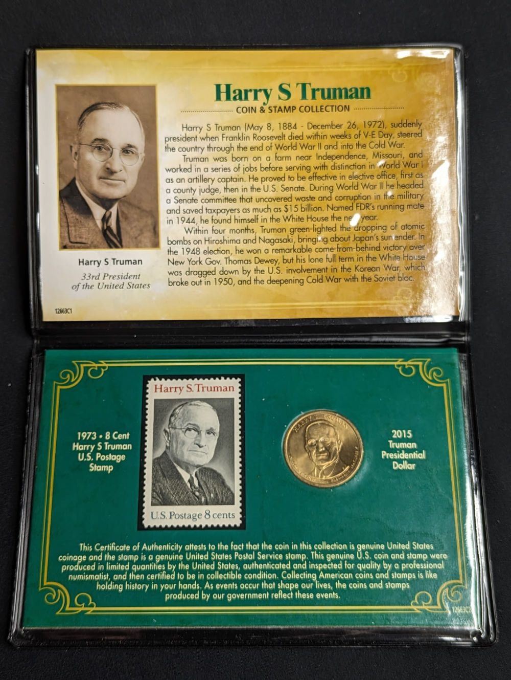 An American Coin Treasure Harry S Truman Coin & amp; Stamp Collection. This coin and stamp depict Harry Truman, The US President that lead us to the victory of world war two.