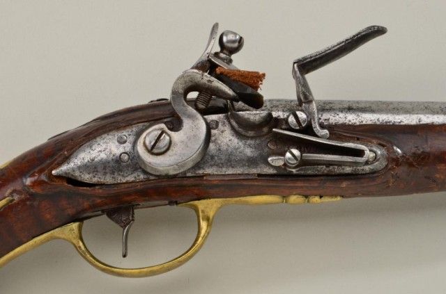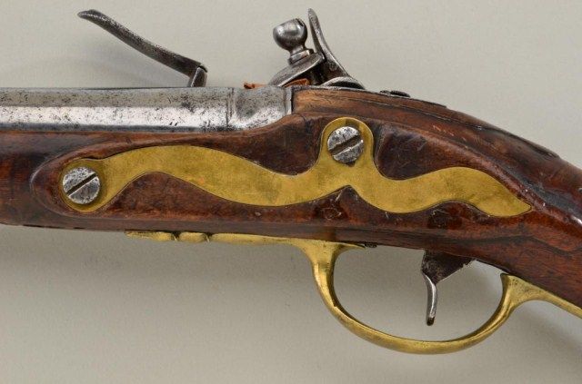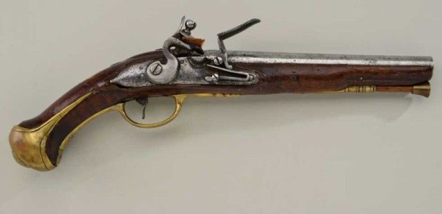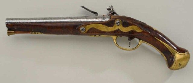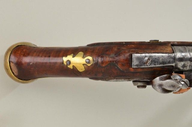 American Curly & Stripped maple stocked Flintlock pistol with English style brass mounts and period associated parts made by early gunsmith or armorer. The pistol measures 16" overall with 9-1/4" barrel ofapprox. 69 caliber smooth bore. The lock plate is a Military type and shows a small cartouche behind the pan which is unreadable. The hammer and frizzen are somewhat crudely hand forged. The mounts are typicallyBritish of about the Revolutionary era. The stock is nicely molded and shows good quality and has some breaks and repairs in the fore end, otherwise good. A crude American type sheet brass inlay is nailed behind the tang. There is a British proof on the breech of the barrel. The side plate is the type used by the British about 1770. The metal surfaces show some pitting and the pistol has been heavily used even the frizzen wasrelined, small losses around the lock area. An interesting American Pistol that could have been used by a Revolutionary war officer. Recently found in Pennsylvania in an old collection. Est.;$1,750-$3,500.