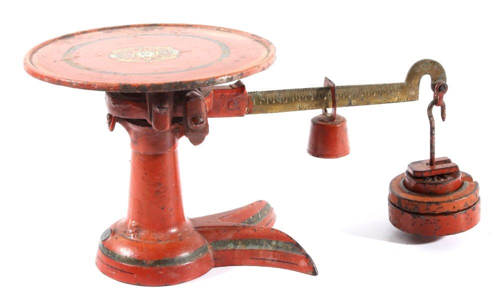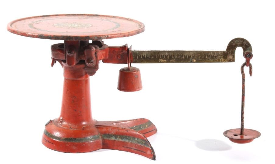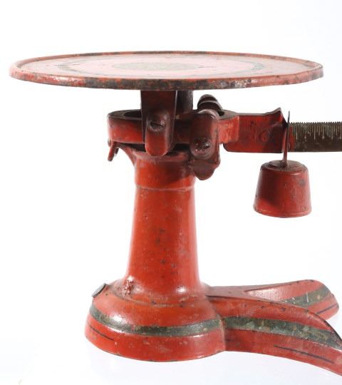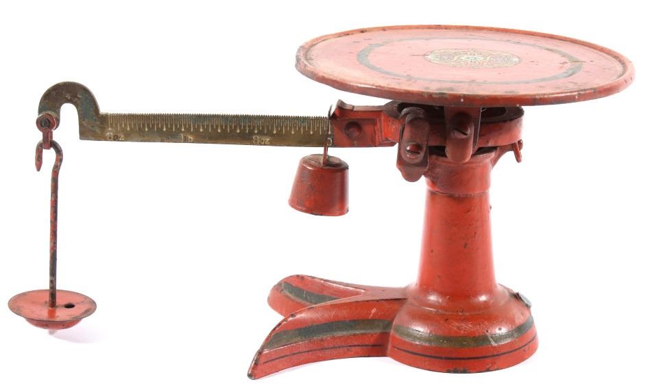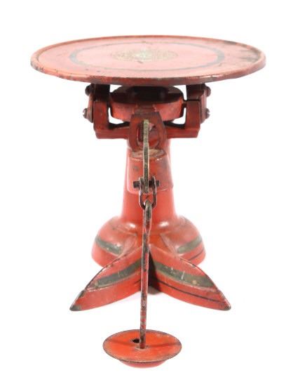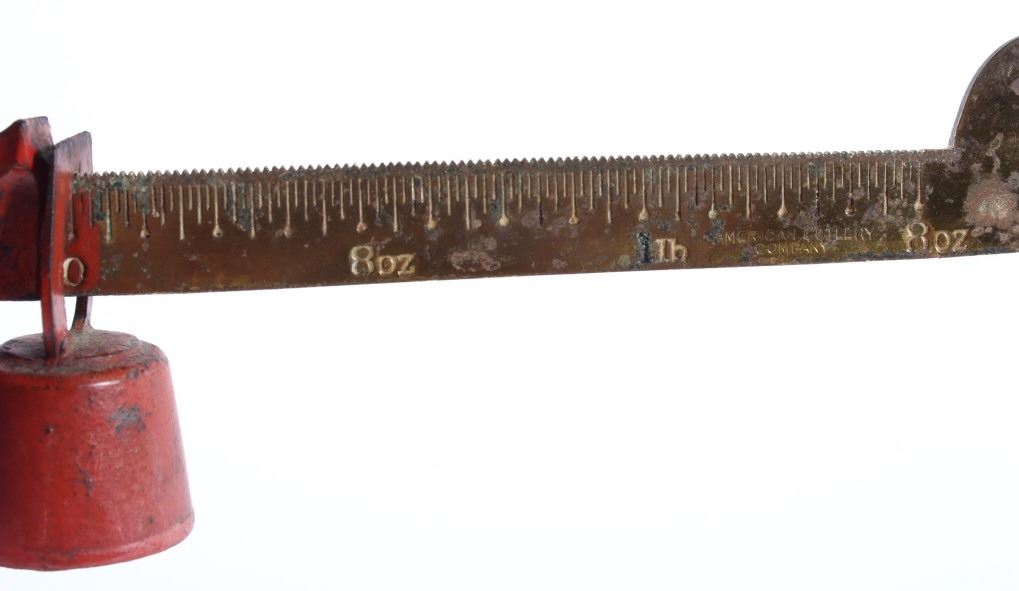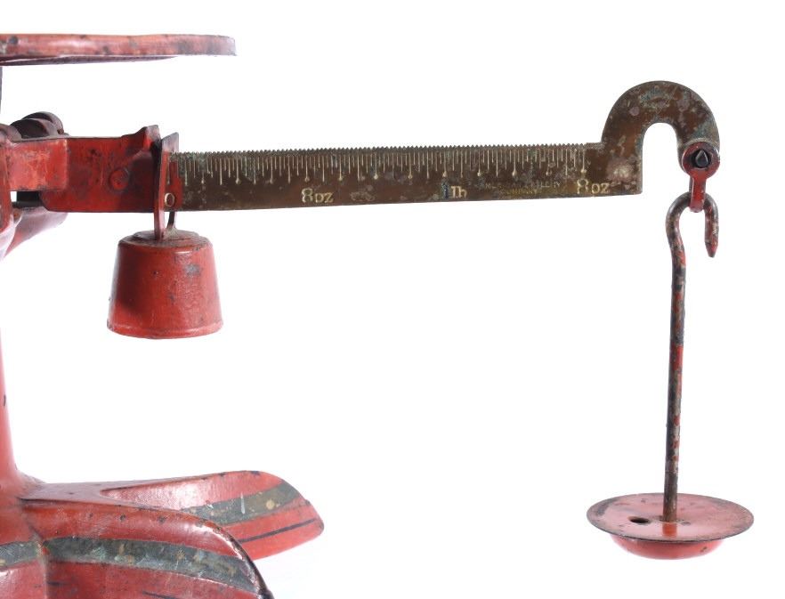 For your consideration in this lot we have a cast iron fishtail sliding weight scale manufactured by American Cutlery Company in the early to mid 20th century. The scale shows cast iron construction with a brass weight arm. The cast iron is painted in a slightly faded red with a stamped design in gold, green, and white across the top. The base of the scale shows a traditional fish tail design with a dark painted band around the base. The arm is marked in ounces and pounds and is marked "American Cutlery Company" across the side. The scale comes with a sliding weight and a set of four hanging weights. The piece shows good condition overall with wear and damage across the paint. The scale measures 12 3/4" long by 7 1/4" wide and 6 1/2" tall.