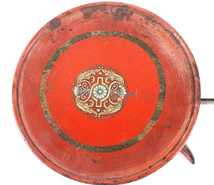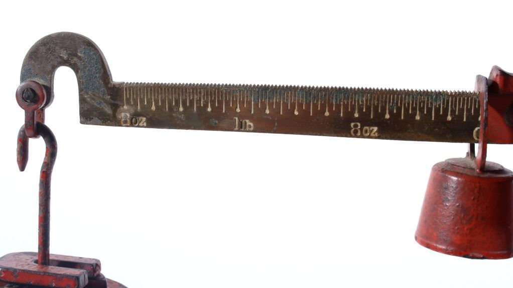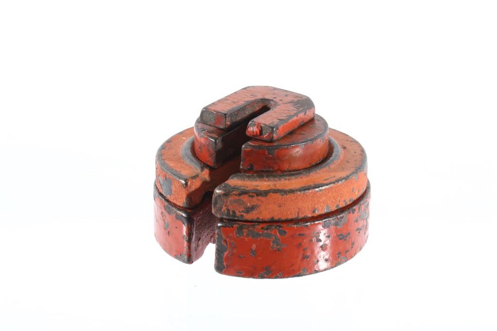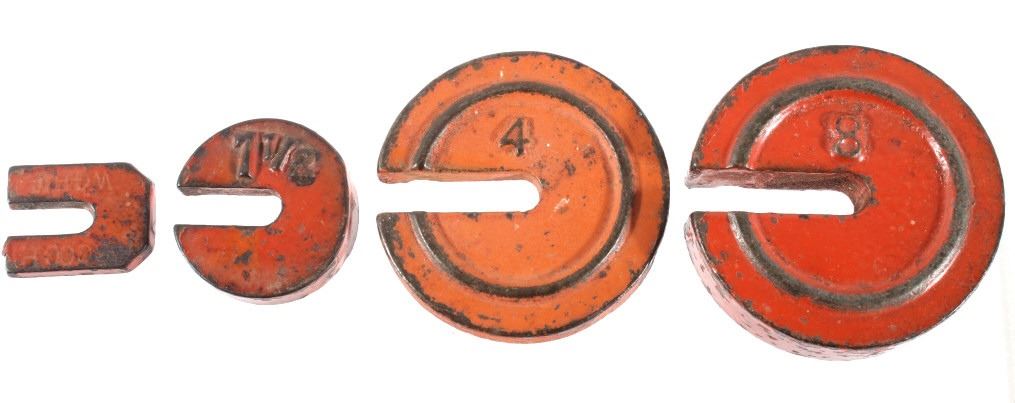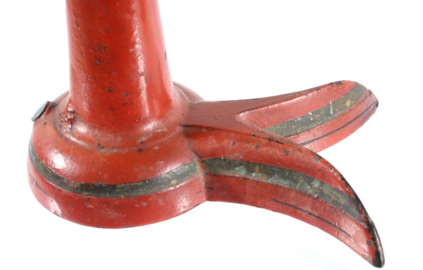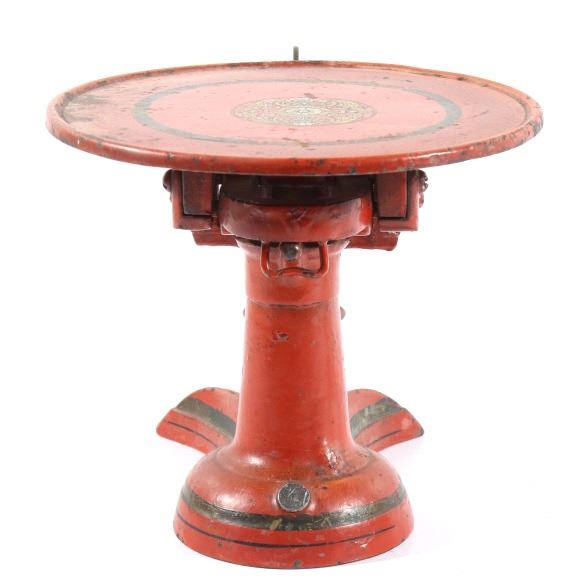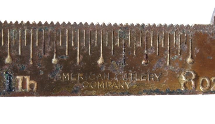 For your consideration in this lot we have a cast iron fishtail sliding weight scale manufactured by American Cutlery Company in the early to mid 20th century. The scale shows cast iron construction with a brass weight arm. The cast iron is painted in a slightly faded red with a stamped design in gold, green, and white across the top. The base of the scale shows a traditional fish tail design with a dark painted band around the base. The arm is marked in ounces and pounds and is marked "American Cutlery Company" across the side. The scale comes with a sliding weight and a set of four hanging weights. The piece shows good condition overall with wear and damage across the paint. The scale measures 12 3/4" long by 7 1/4" wide and 6 1/2" tall.