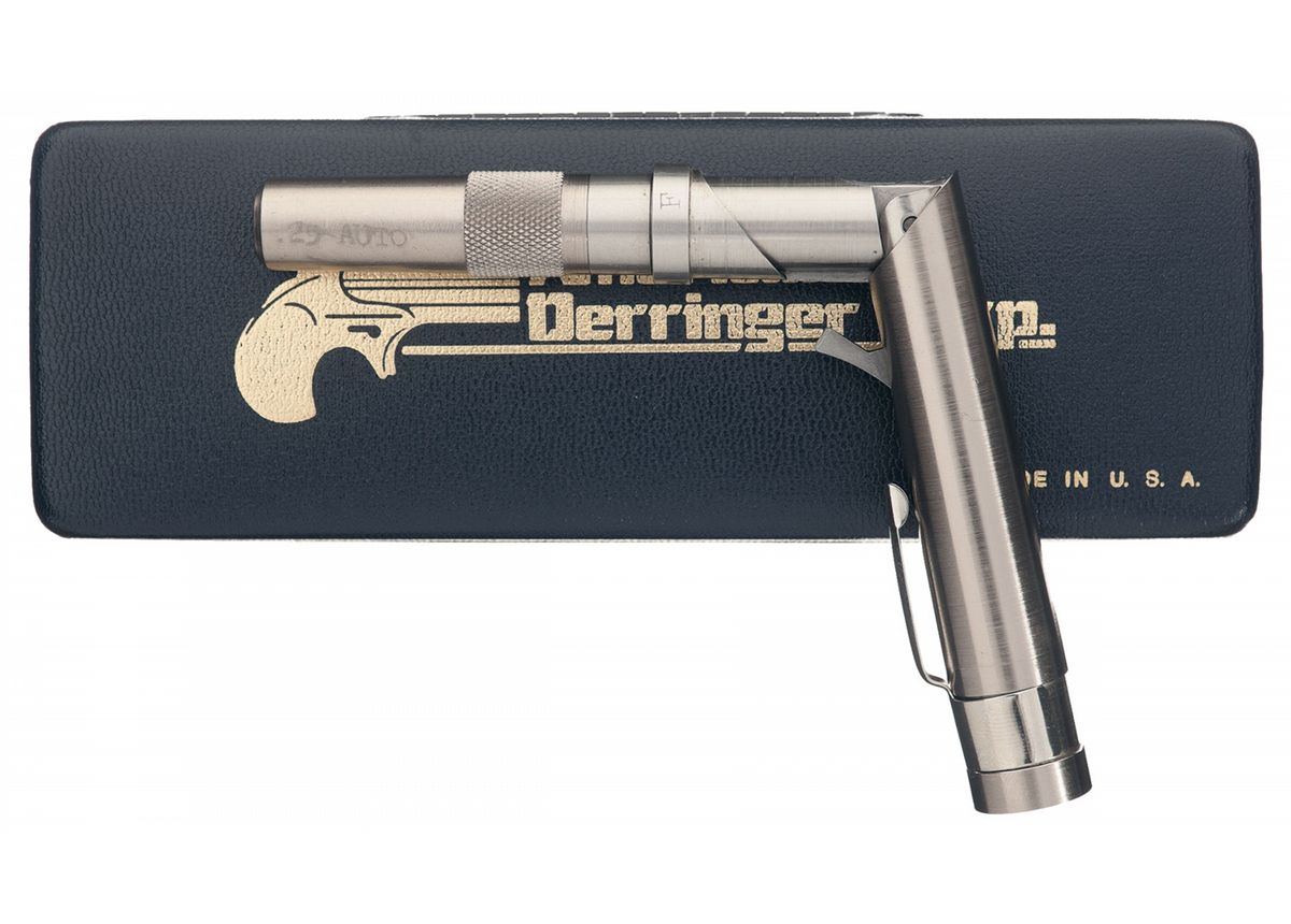 These "pen" pistols were manufactured between 1993 and 1994. Designed by Bob Braverman as a last resort defensive weapon. This pistol resembles a "pen" when in the normal straight position. Pulling it apart and bending it into an "L" shape allows the trigger to pop out and it is ready for firing. The side is marked "ADC WACO, TX.". With an American Derringer Corp. hardcase.