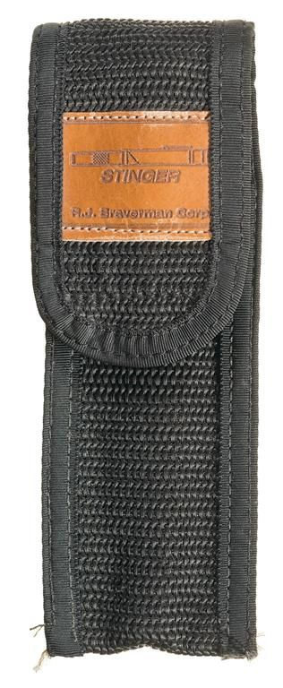 Introduced in 1993. 5 1/2 inches long in the closed position, with "ADC WACO TX" on the main body. Complete with a mismatched nylon belt pouch marked "STINGER/R.J. BRAVERMAN CORP.