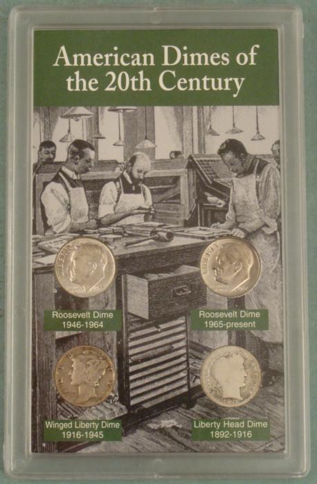 The coming age of U.S. coinage. This collection contains every type of U.S. design from 1892 to present, including the classic .900 Fine Silver Liberty Head (1892-1916) designed by Charles E. Barber; the .900 Fine Silver Mercury or Winged Liberty Dime (1916-1945) created by Adolph A. Weinman, an imaginative new design for the century; the .900 Fine Silver Roosevelt Dime (1946-1964), designed by John R. Sinnock to honor the president and wartime leader; and a flawless Proof specimen of the historic clad Roosevelt Dime (1965-present). * The dates are as follows: * 1907 Liberty Head Dime 1943 Winged Liberty Dime 1955-S Roosevelt Dime 1967 Roosevelt Dime