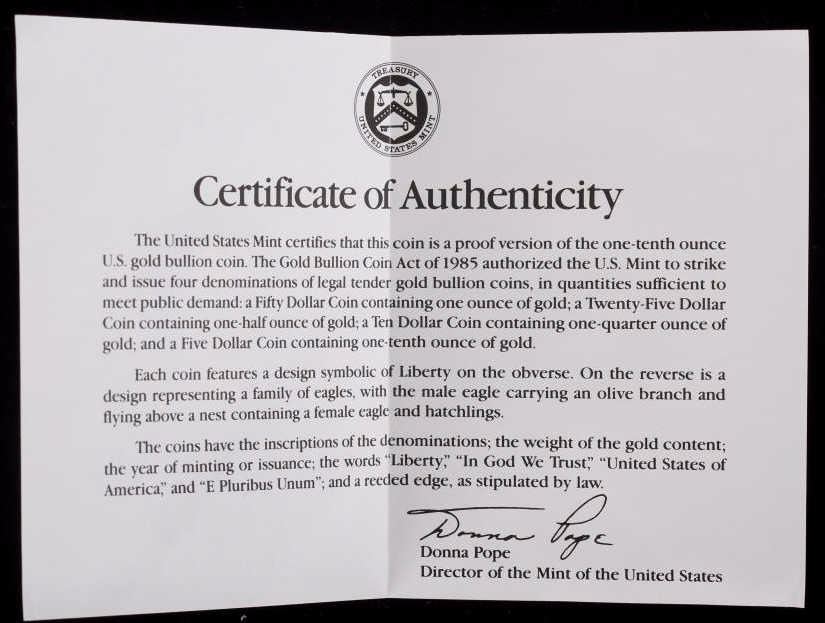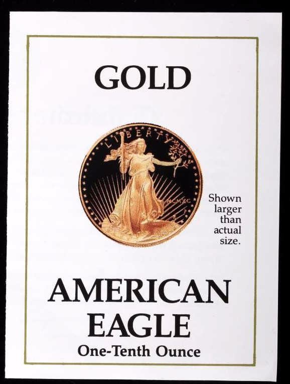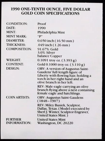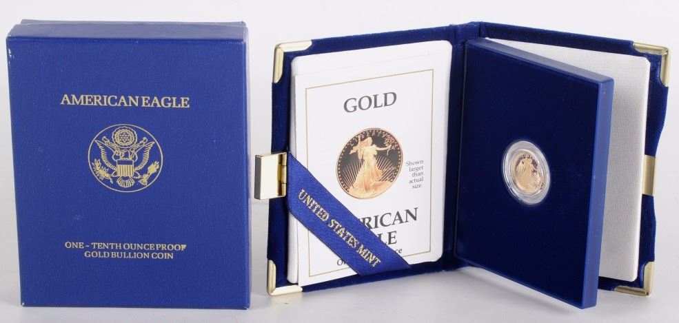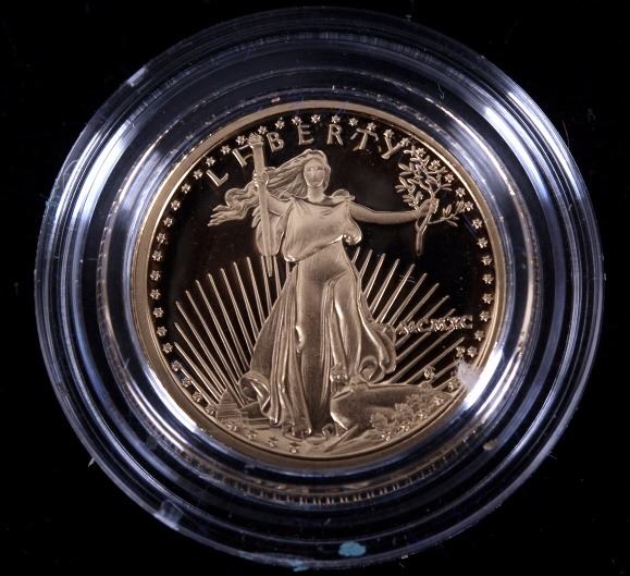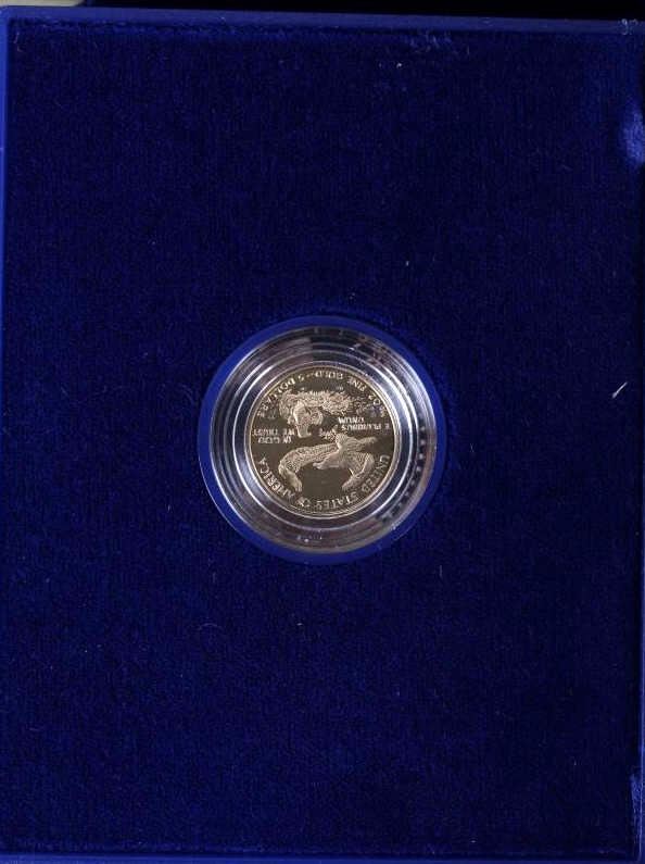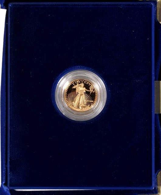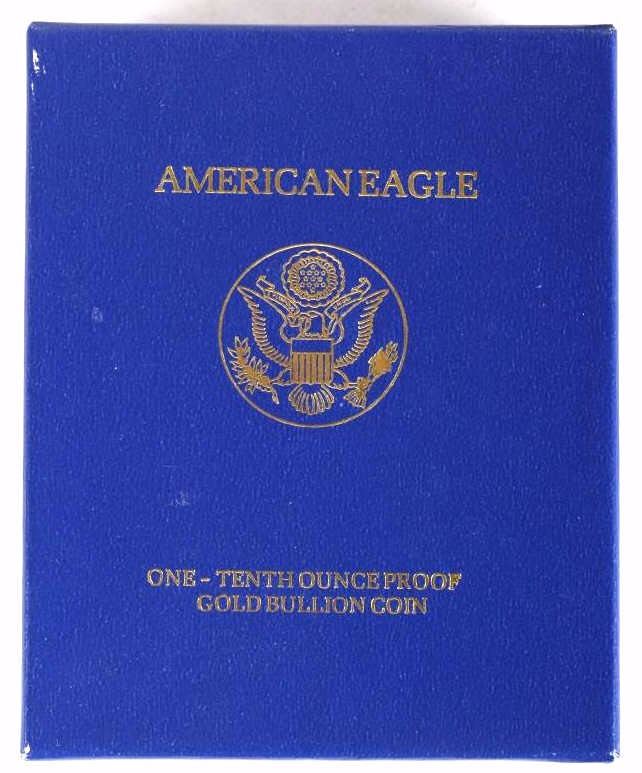 This lot features a 1990 minted American Eagle one-tenth ounce gold proof coin. The obverse depicts a version of Augusts Siant-Gauden's full length figure of liberty with flowing hair, holding a torch in her right hand and an olive branch in her left. Meanwhile, the reverse has a male eagle carrying an olive branch flying above a nest containing a female eagle and eaglets. The coin domes in a case form the US mint and its original box. The overall condition of the piece is good for its age. Measures: 4 1/4" L x 3 7/16" W x 7 1/16" H