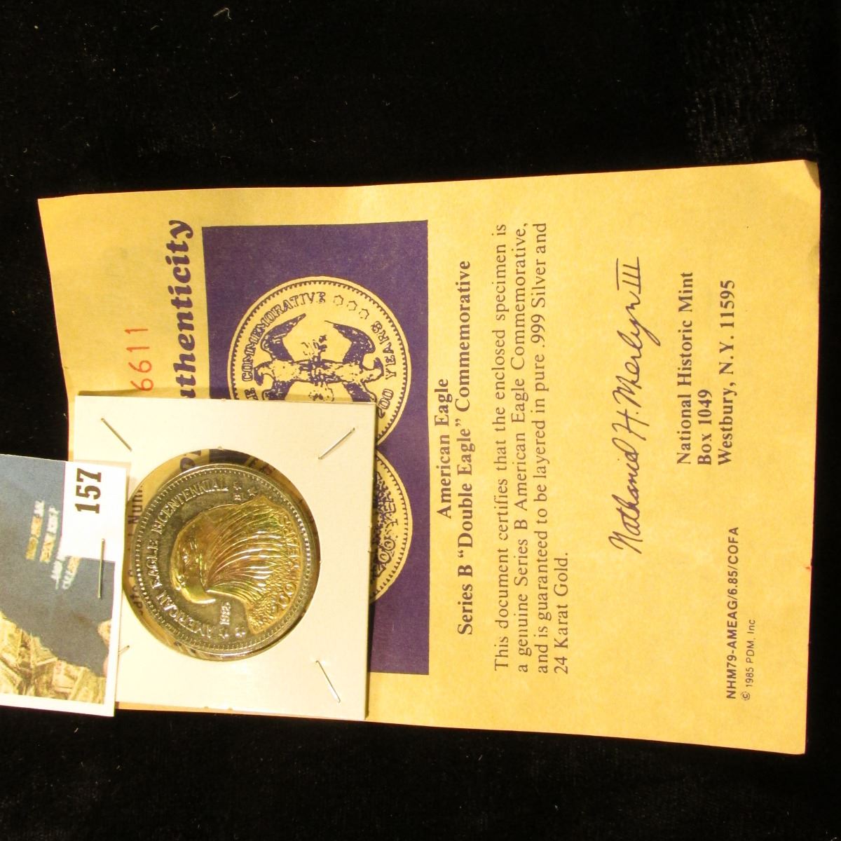 American Eagle Series B "Double Eagle" Commemorative with certificate of Authenticity. Layered in both genuine .999 Silver and 24 Karat Gold. 39mm.