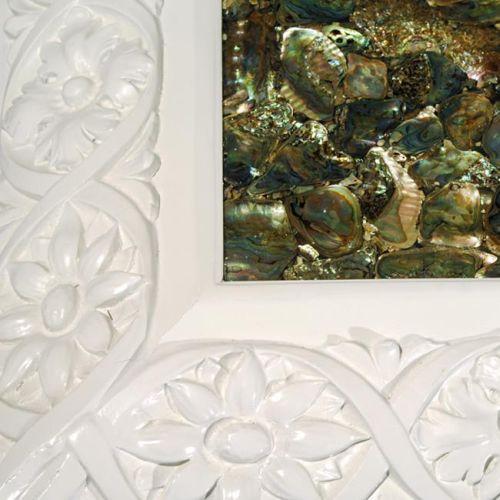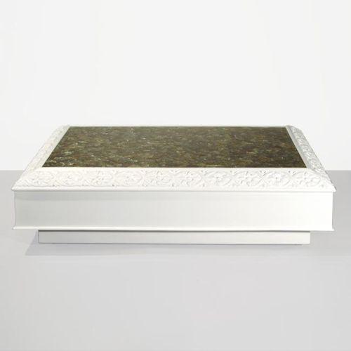 17h x 64w x 46d inches, off white lacquered wooden base, clam shells cast in clear resin, in very good condition