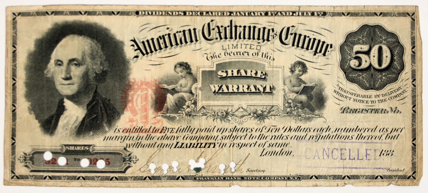 This share warrant, printed by the Franklin Bank Note Co., entitled the bearer to five shares at $10 apiece. The shares have been awarded as this warrant has been cancelled. 3 x 7"