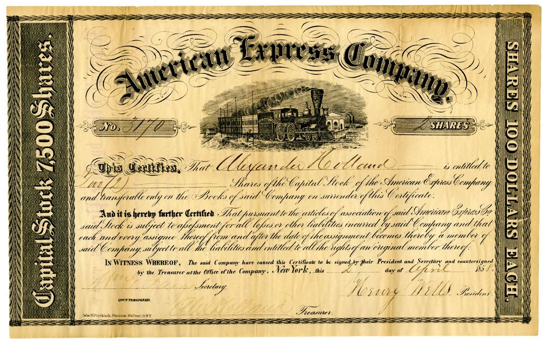 American Express Co. 1858 Issued Stock Certificate Signed by Henry Wells and William Fargo