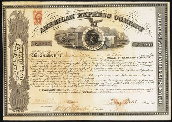 New York, NY, 1865, 1 Shares, Issued and uncancelled but transferred, Black with no underprint, Capital Stock 6,000 Shares, Unlisted Type, Henry Wells, William Fargo and Holland autographs, bulldog facing left with small eagle on top flanked b train station with train on left and steamship with wharf scene on right, Fine to VF condition with light toning and foxing, Scarce unlisted earlier Stock Capitalization variety.