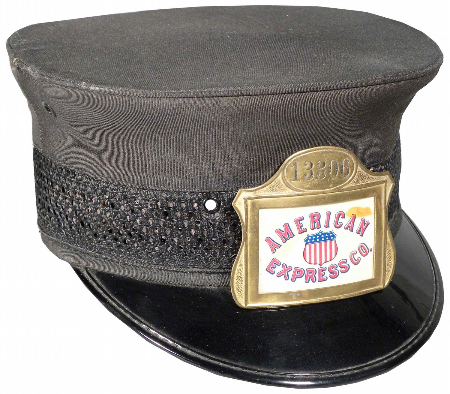 American Express Company Agents Cap with Celluloid badge #13306. Excellent condition.