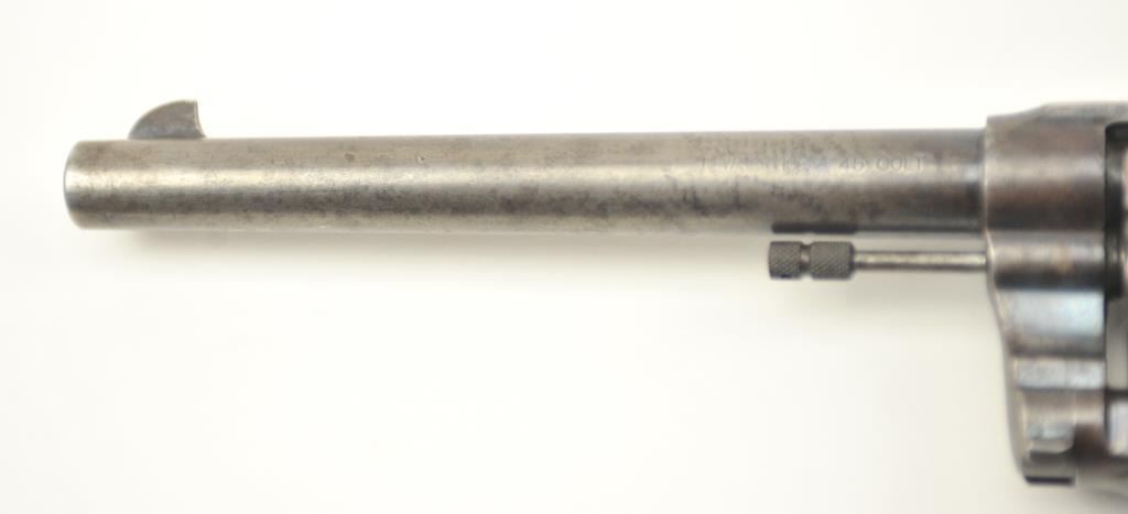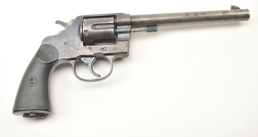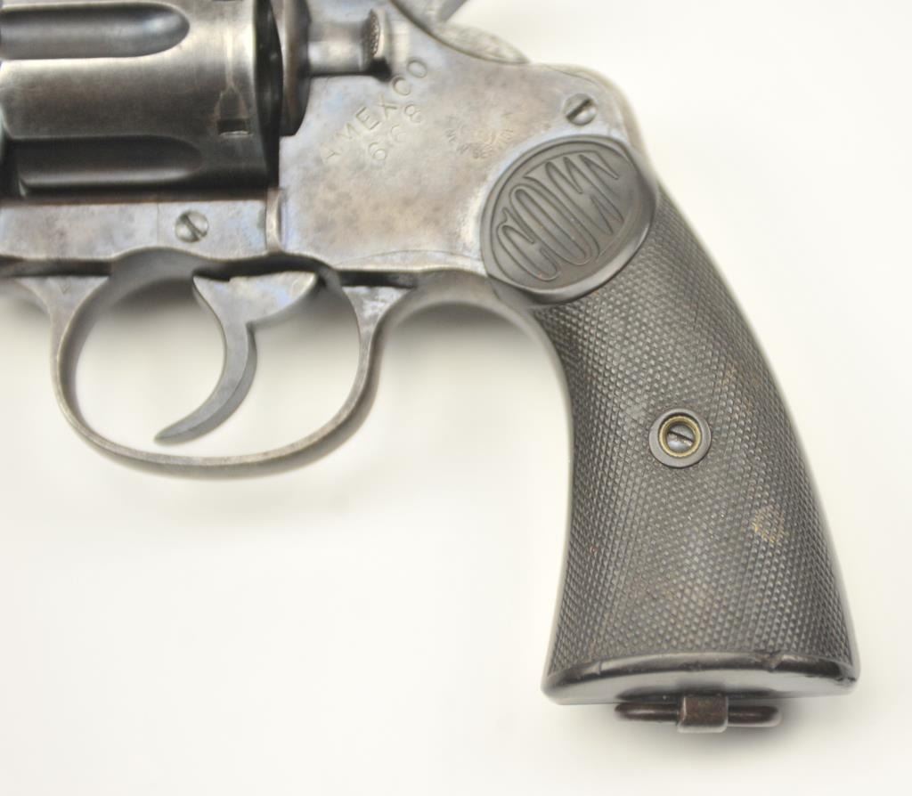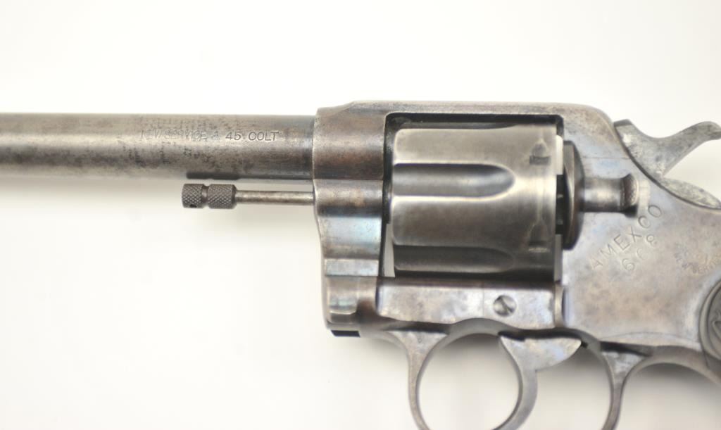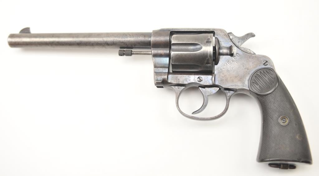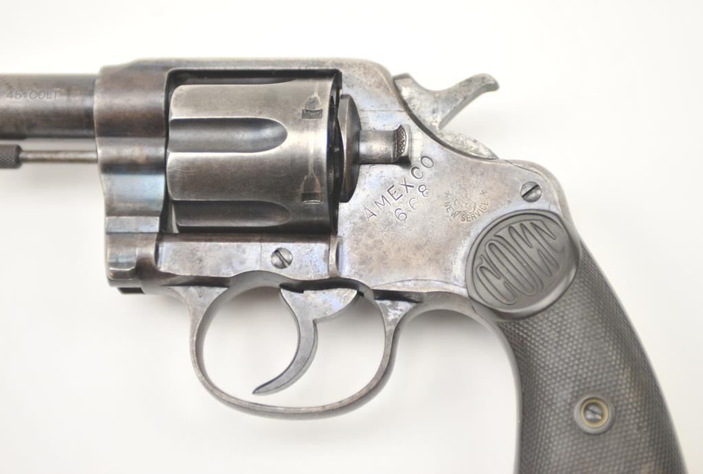 American Express Company Marked Colt New Service DA revolver, .45 Colt caliber, Serial #18039. The pistol is in good to very good overall condition with a 7 ½” barrel. The pistol shows scattered original blue finishin protected areas with the left side of the frame and butt strap stamped, “AM EX CO 668”. The checkered hard rubber grips are in very good condition with flea bite nicks at the edge of the left grip and the lanyardring is retained. The bore is good +, the action is crisp and the markings are sharp on this New Service with American Express markings circa 1907. Est.: $800-$1,600. (C+R/PPT).