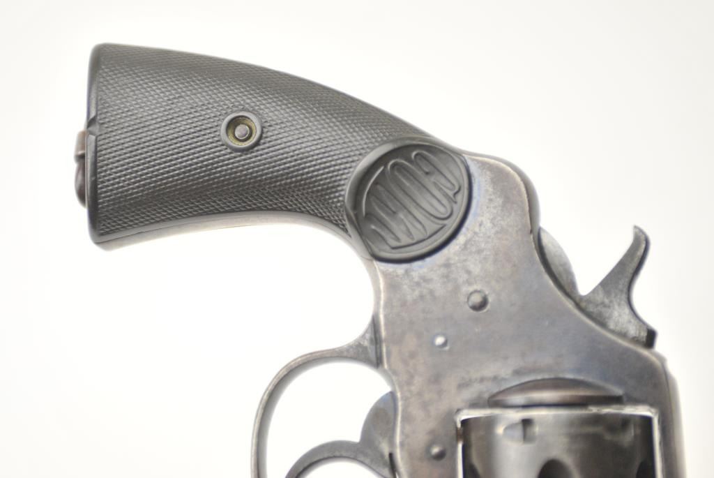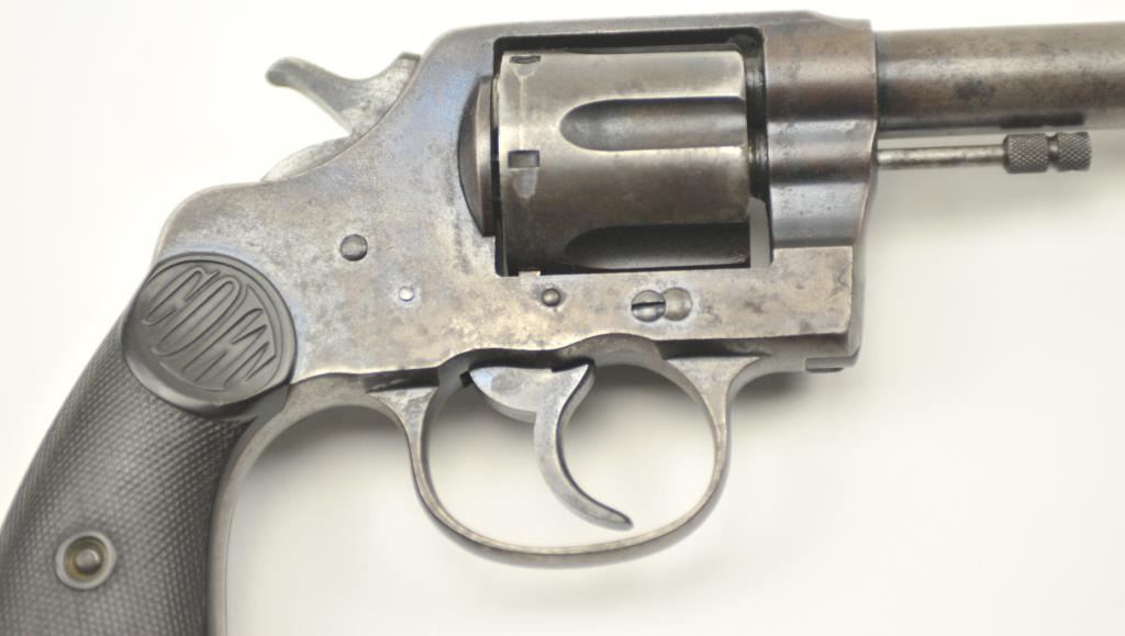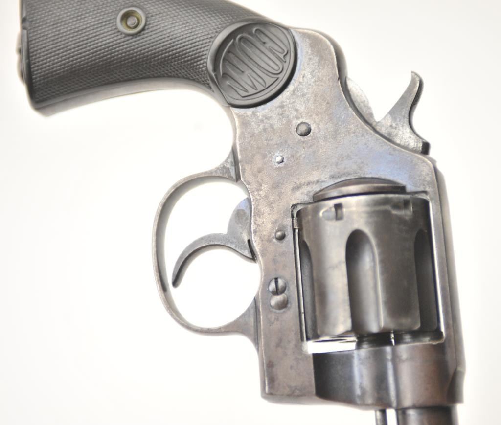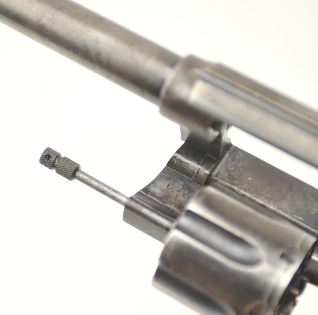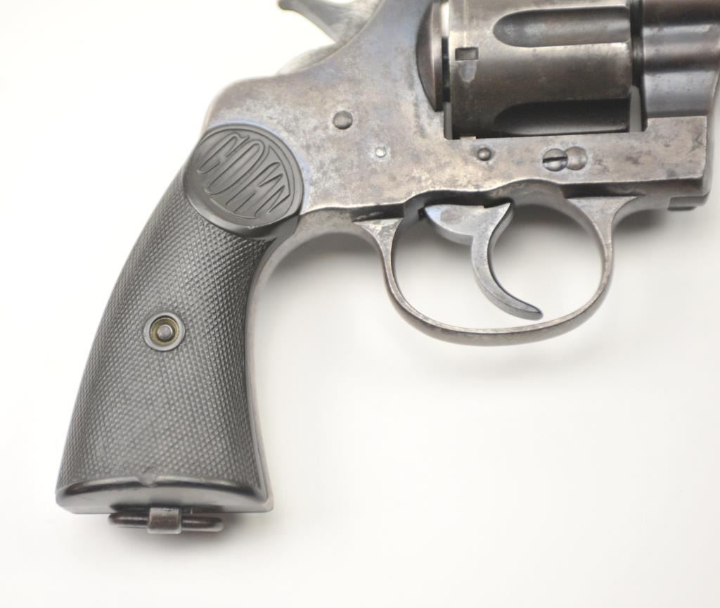 American Express Company Marked Colt New Service DA revolver, .45 Colt caliber, Serial #18039. The pistol is in good to very good overall condition with a 7 ½” barrel. The pistol shows scattered original blue finishin protected areas with the left side of the frame and butt strap stamped, “AM EX CO 668”. The checkered hard rubber grips are in very good condition with flea bite nicks at the edge of the left grip and the lanyardring is retained. The bore is good +, the action is crisp and the markings are sharp on this New Service with American Express markings circa 1907. Est.: $800-$1,600. (C+R/PPT).