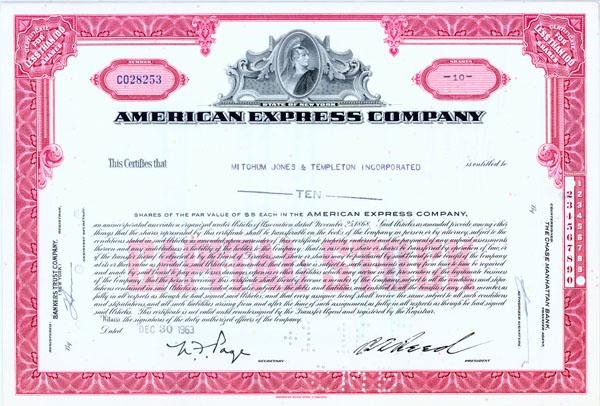 1964, New York. Stock certificate for 1 shares. Red/Black. Engraved vignette of the American Express Centurion at top center. Punch cancelled and Excellent.