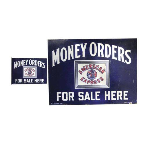 American Express World Service Money Orders Porcelain two sided flange sign. 1860-725. Some minor rust around edges otherwise excellent condition. 18 X 13 1/2 inches.