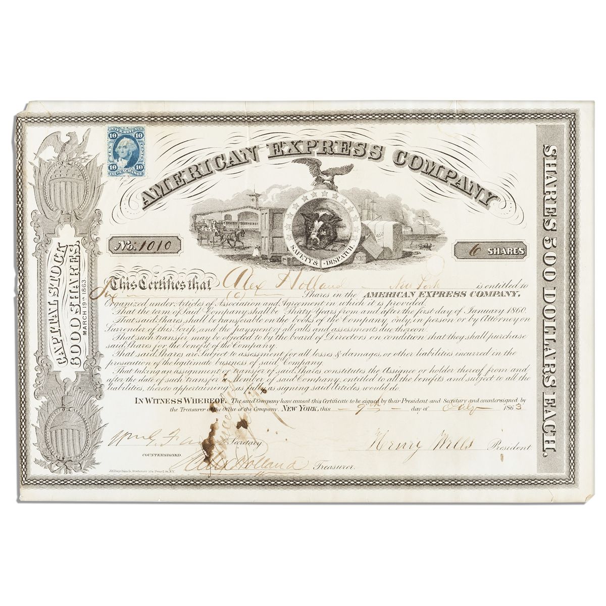 Henry Wells and William Fargo signed stock certificate for American Express. Datelined New York, 9 July 1863, document certifies that ''Alex Holland...is entitled to Six (6) Shares in the American Express Company...'' Countersigned by Alex Holland. Single-page printed document measures 12'' x 8.25''. Cancellation inscription is smudged and runs through the signatures of Fargo and Holland. Very light dampstaining throughout. Very good condition.
