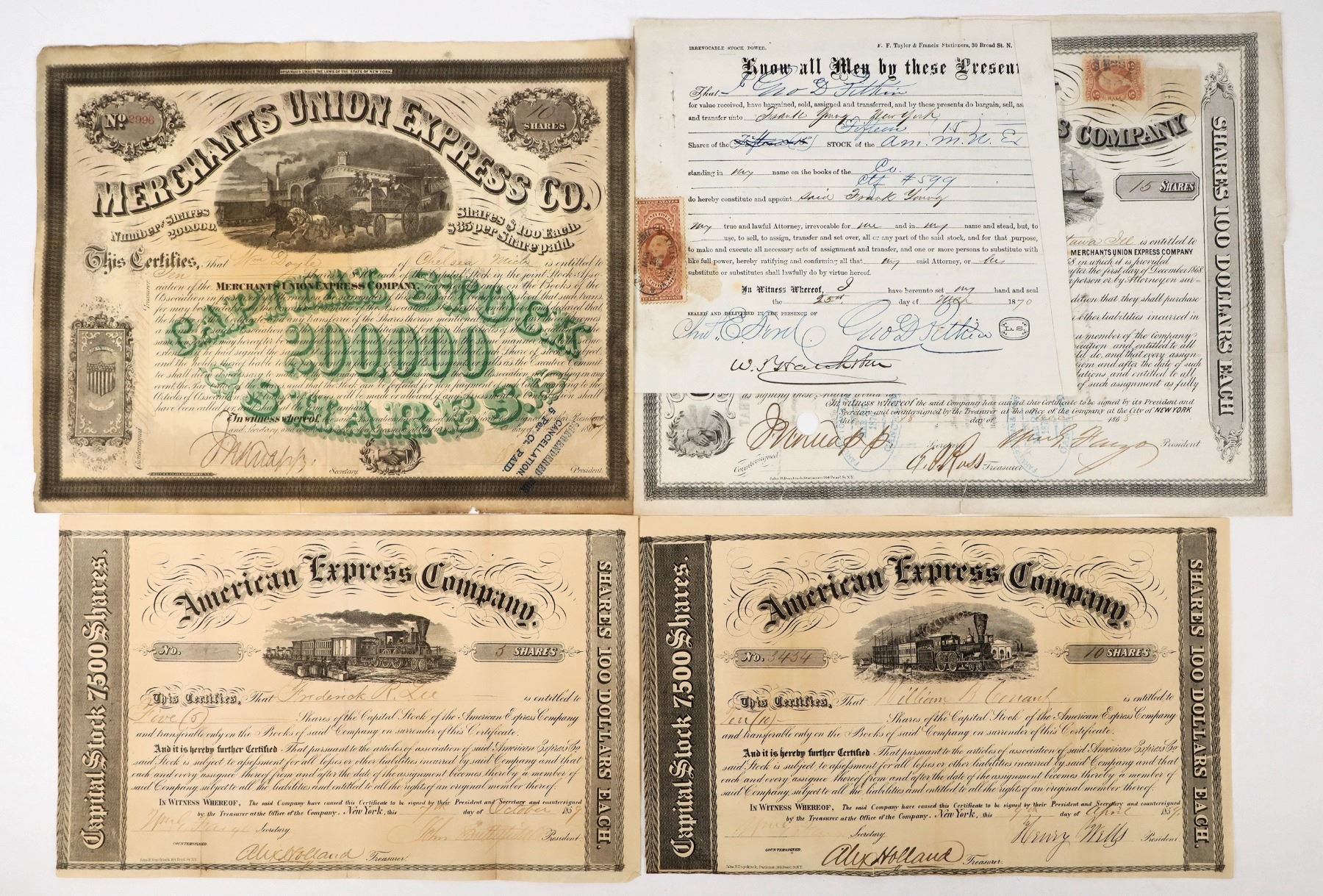 Lot of 4 different. This rare and important group shows the evolution of the company for this decade in their history and includes key autographs. Includes: American Express April 1859 signed by Henry Wells, William Fargo, and Alex Holland; American Express October 1859 signed by John Butterfield, William Fargo, and Alex Holland; Merchants Union Express Company 1867 signed by Knapp and Ross (this was the competitor to Amex); and American Merchants Union Express Company 1868 signed by Fargo, Knapp, and Ross. Please see photos for more details. For more history on the company and the different stock types issued, please see Fred Holabird's essay at: https://www.holabirdamericana.com/s/American-Express-and-Wells-Fargo-ajhp.pdf.