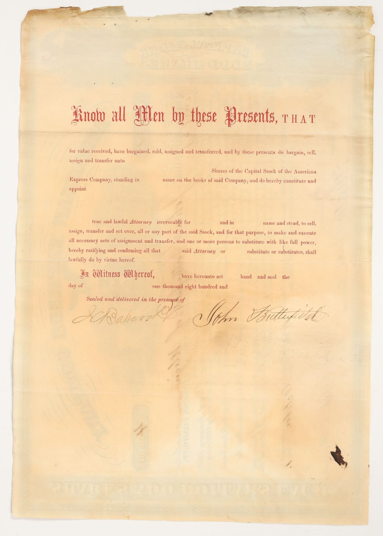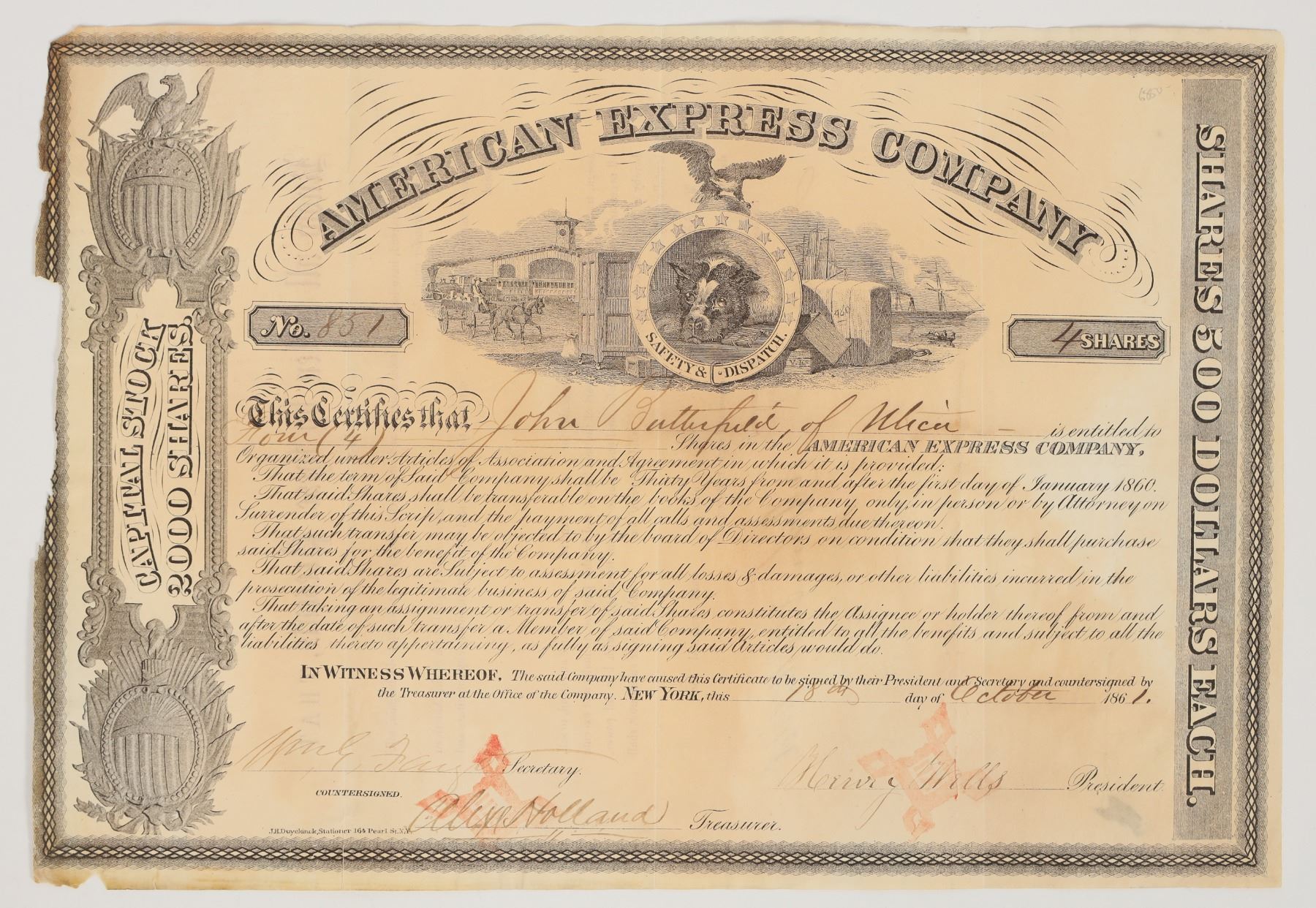 Key certificate with signatures of the 4 important players in the company! No. 851 issued for 4 shares to John Butterfield of Utica in October 1861. Signed by Henry Wells as president, William Fargo as secretary, and Alex Holland as treasurer. Stamp cancelled. Signed on the reverse by Butterfield. Safety & Dispatch vignette. Folds, wrinkles, heavy toning, rough left edge. 8 x 11.5" The new company that emerged from the shareholder buyout started with a Capital stock of 2,000 shares. The Company completely changed the physical appearance of the stock certificates, opting for a "Safety and Dispatch" theme with a vignette that represented more express wagons, steamship lines, package delivery, with less emphasis on trains, though they kept a train in the background on the left side of the vignette. These certificates were issued for a scant two years! Read Fred Holabird's full essay at: https://www.holabirdamericana.com/s/American-Express-and-Wells-Fargo-ajhp.pdf
