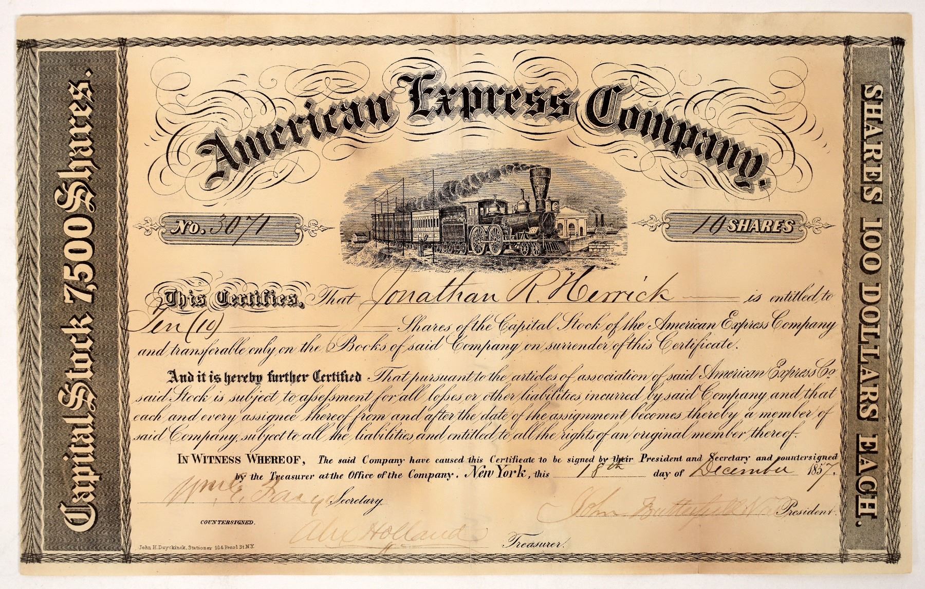 American Express Butterfield and Fargo signed stock certificate issued to Jonathan R. Herrick (1818-1890) for ten shares at $100 per and dated December 18, 1857. It is hand cancelled and has steam locomotive vignette. In very nice condition. Please see photos for more details.