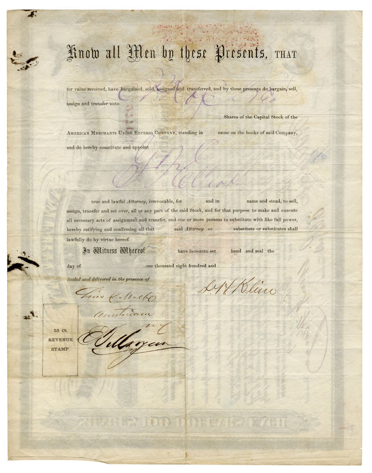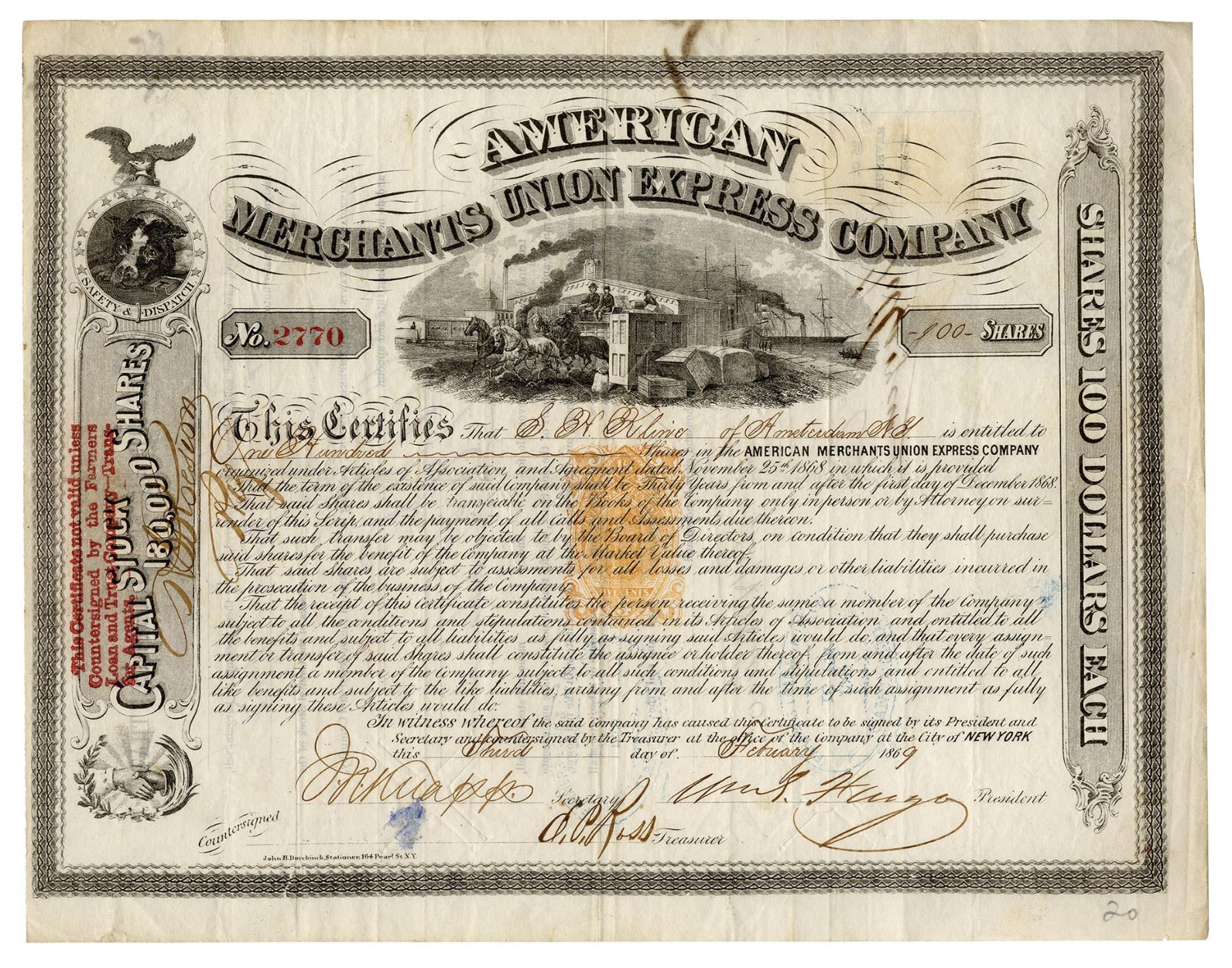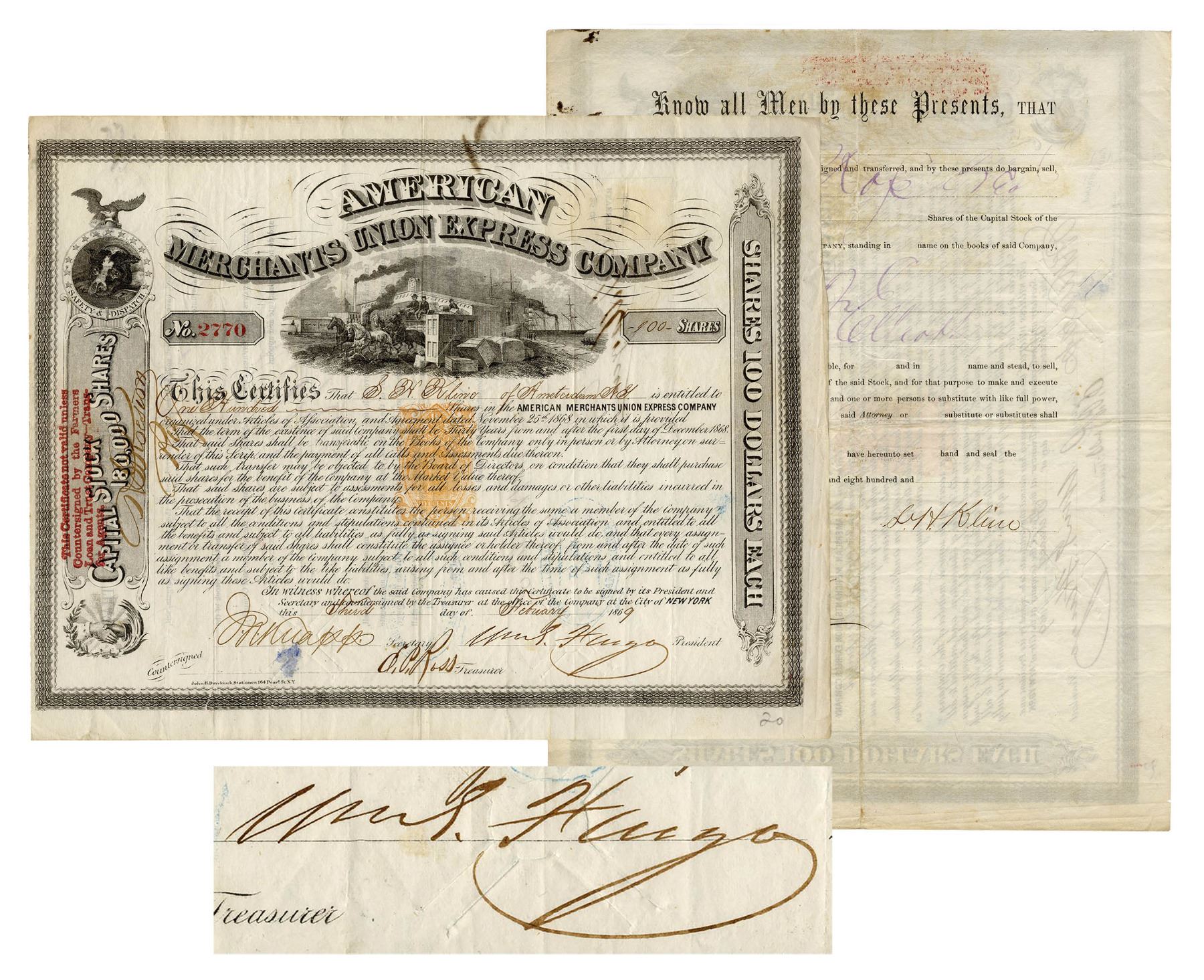 American Express stock signed by William Fargo as President. Dated 3 February 1869 at which time Fargo operated both American Express Co. and also Wells Fargo & Co., which he founded with Henry Wells in order to expand into California. Measures 12'' x 9.5''. Very good plus condition.