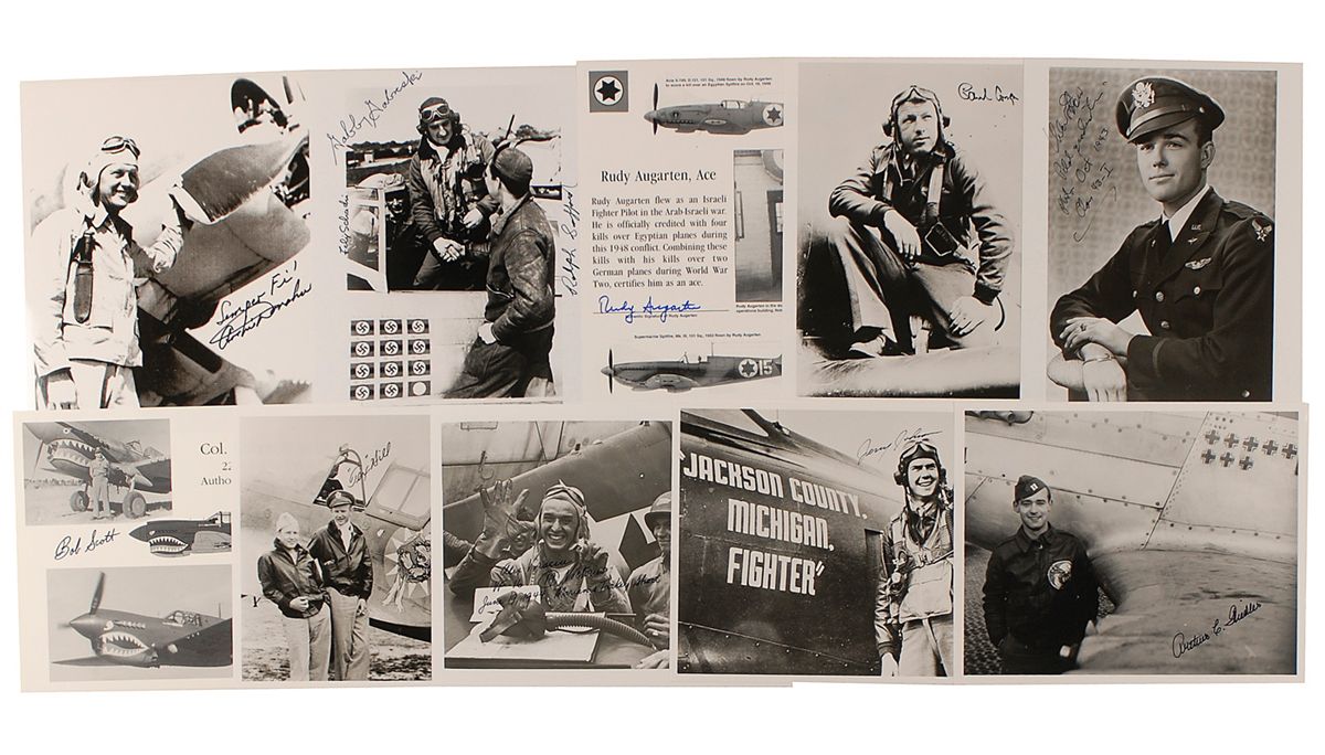 Ten signed photos, various finishes, ranging in size from 8 x 10 and 10 x 8 up to 8.5 x 11, each signed in ink or felt tip by the respective ace pictured. Signers are: Archie Donahue, Jerry Johnson, Alex Vraciu, Urban L. Drew, Tex Hill, Art Fielder, Paul Conger, Rudy Augarten, Robert L. Scott, and Gabby Gabreski, also signed by crew chief Ralph Safford and assistant crew chief Felix Schacki. In fine condition.