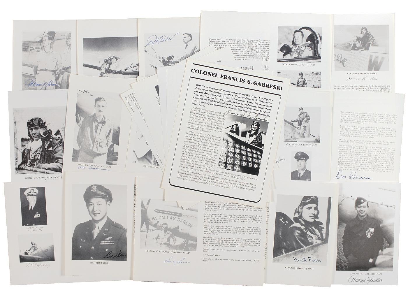 Twenty American Aces biographical sheets, 10 x 8 or 8 x 10, each signed in ink by the respective ace pictured. Signers are: Rex Barber, Ed Rector, Jim Peace, William Freeman, John W. Mitchell, William Shomo, Francis S. Gabreski, John D. Landers, Al Vraciu, Sanford Moats, Don Baccus, Arthur F. Jeffrey, C. M. Isaacson, Archie Donahue, Arthur C. Fieldler, Mick Finn, Fred R. Ohr, Randy Reeves, Stanley W. Veitasa, and Robert H. Moore. In overall fine condition.