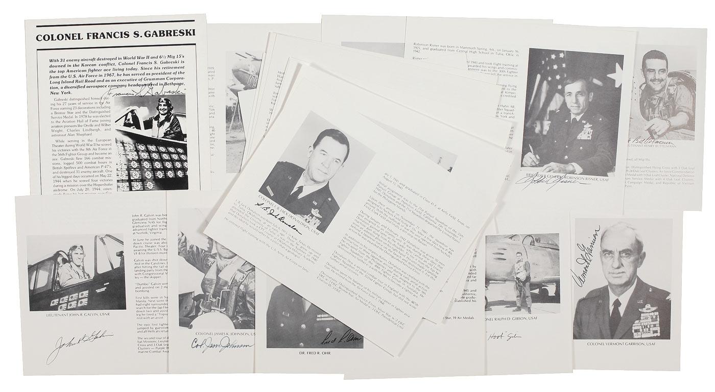 Twenty bio/photo sheets, one 8 x 10 and nineteen 10 x 8, each signed in ink or felt tip by the respective ace pictured. Signers are: Gabby Gabreski, Butch Voris, Robbie Risner, Ralph Parr, Ralph Wandrey, Steve Ritchie, Sandy Moats, Herbert Valentine, Jim Morehead, Red McColpin (American-born British ace), Richard Fleischer, I. B. Donaldson, Fred Ohr, Hank Buttleman, John Lowell, Jim Ince, Jim Johnson, Ralph Gibson, John Galvin, and Vermont Garrison. In fine condition.