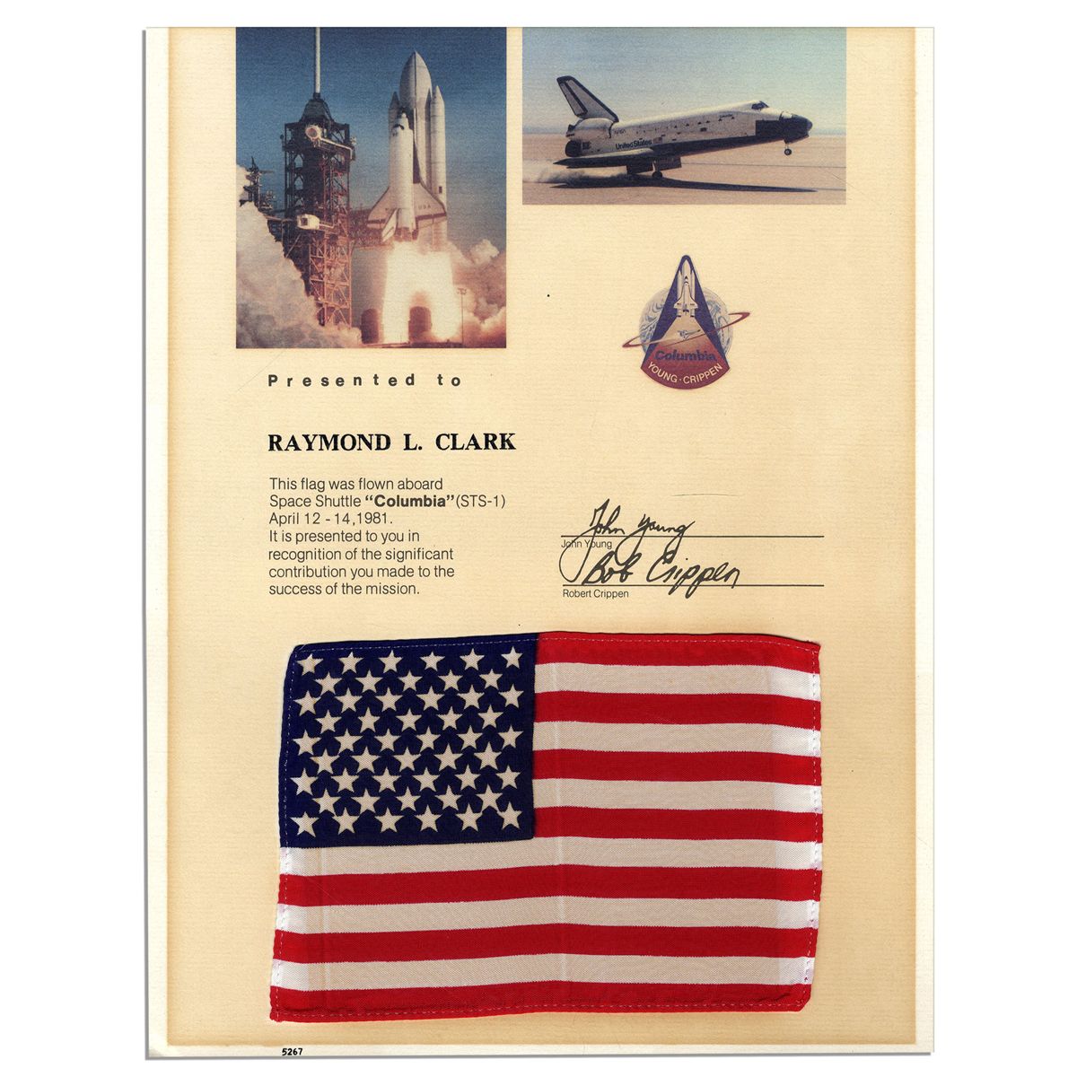 U.S. flag flown in space aboard the Columbia on NASA's very first space shuttle mission. This ''Stars and Bars'' orbited Earth 36 times in the shuttle. Flag is mounted to a certificate bearing mission insignia and photos of the spacecraft, along with a printed statement that reads: ''Presented to Raymond L. Clark / This flag was flown aboard Space Shuttle 'Columbia' (STS-1) April 12-14, 1981. It is presented to you in recognition of the significant contribution you made to the success of the mission.'' Flag measures 5.75'' x 4''. Certificate measures 8.5'' x 11''. Toning to certificate, else near fine.