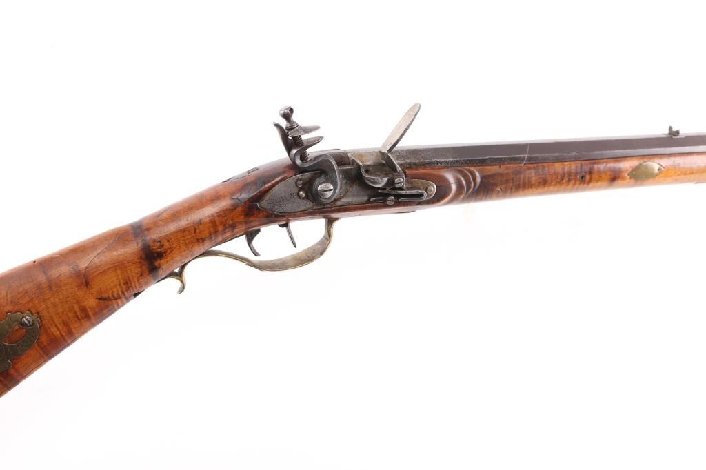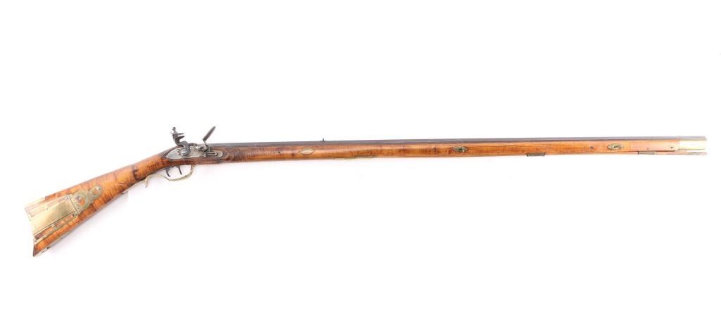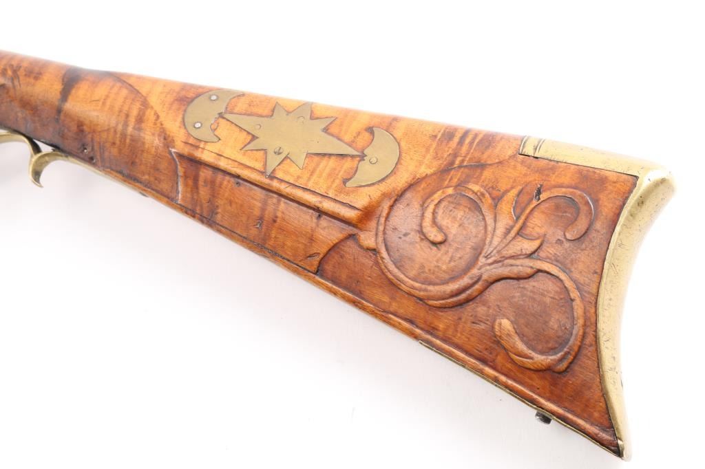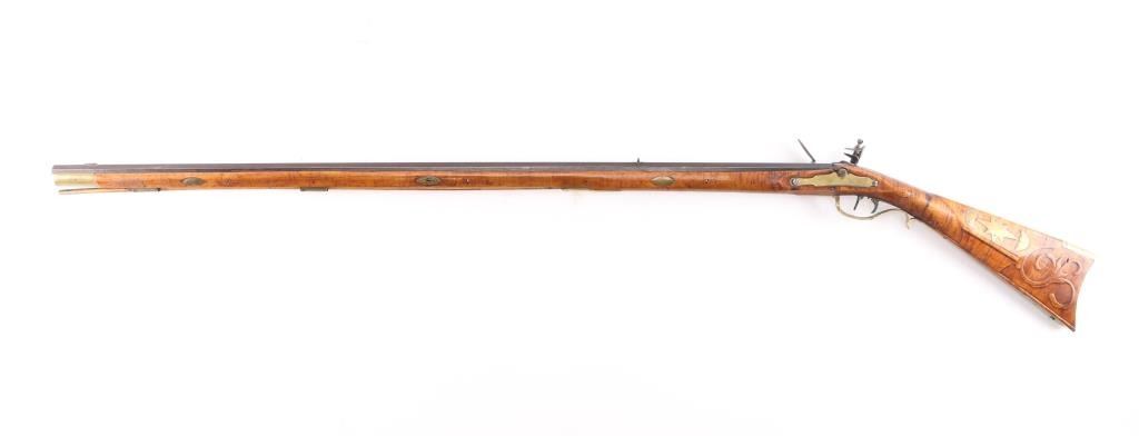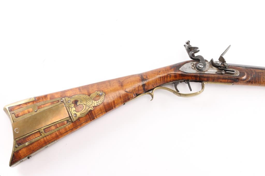 w/ raised carved stock and side plate. Secured by 2 large screws and small. Engraved and pierced patchbox. Silver and brass inlays and escutcheons. The lock is a re-conversion back to flint from percussion and the rifle reduced 4"-8" in its working life 56-1/2" overall and 41-1/2" BBL. Approx. 36 cal. rifled bore. The butt is fairly fat, measures about 1-1/4" across the widest part of top. The stock has been refinished and shows some repair and restoration. There is a dark line around the wrist area, but does not seem to have been broken through (fill to hide crack or what I can not discern) The carving is still fairly well defined. Larry Shelton famous California author, collector and rifle enthusiast estate. Worth proper restoration.