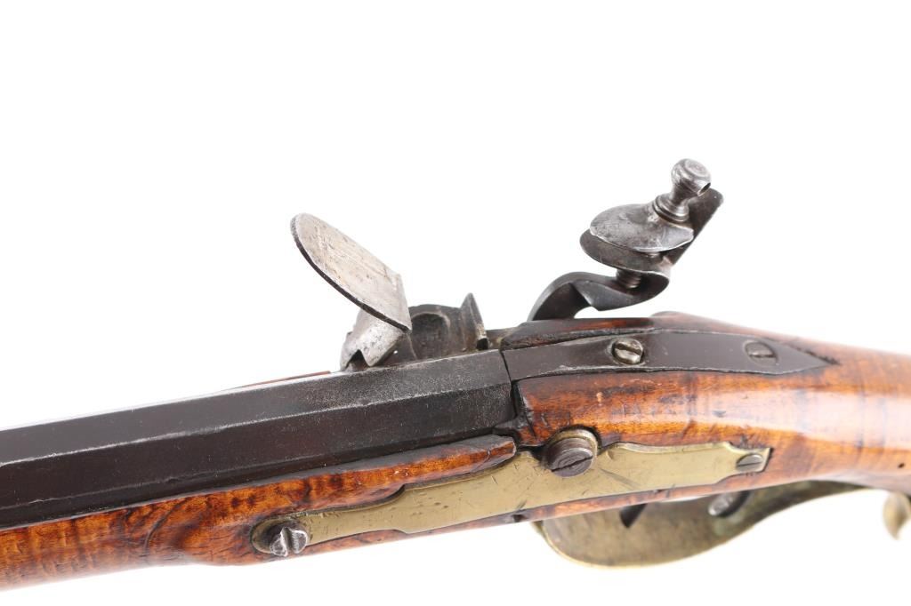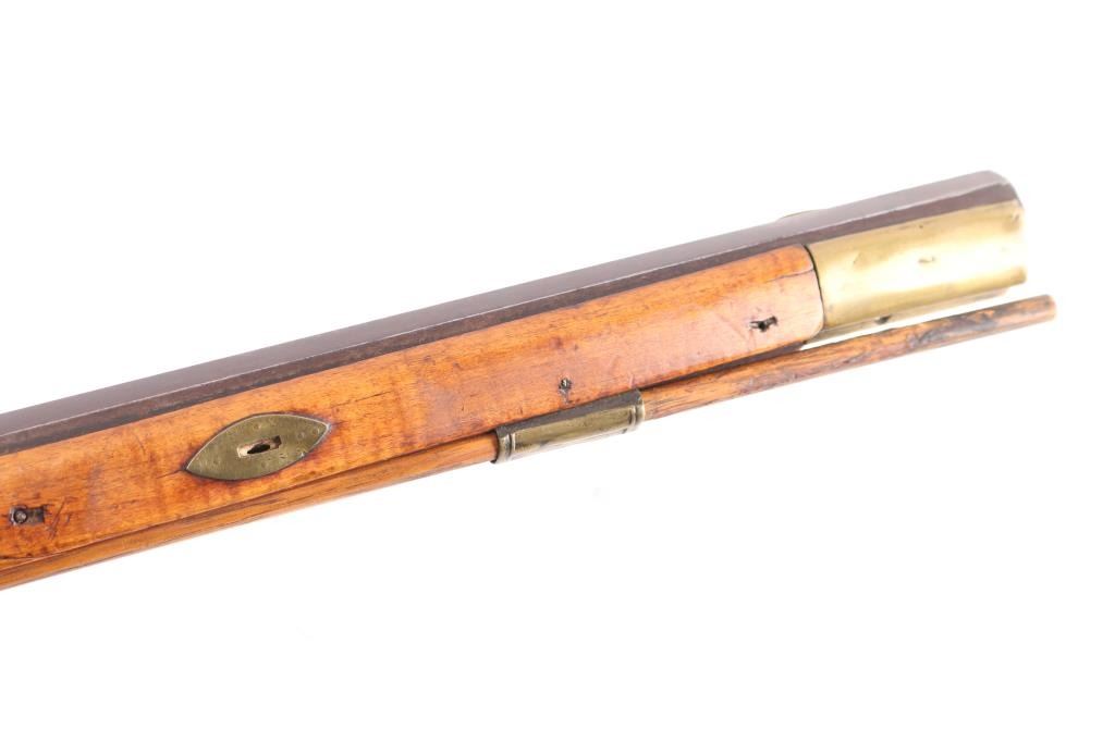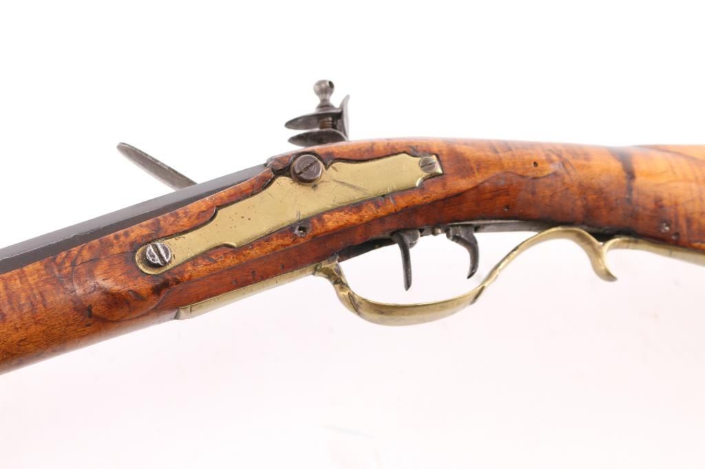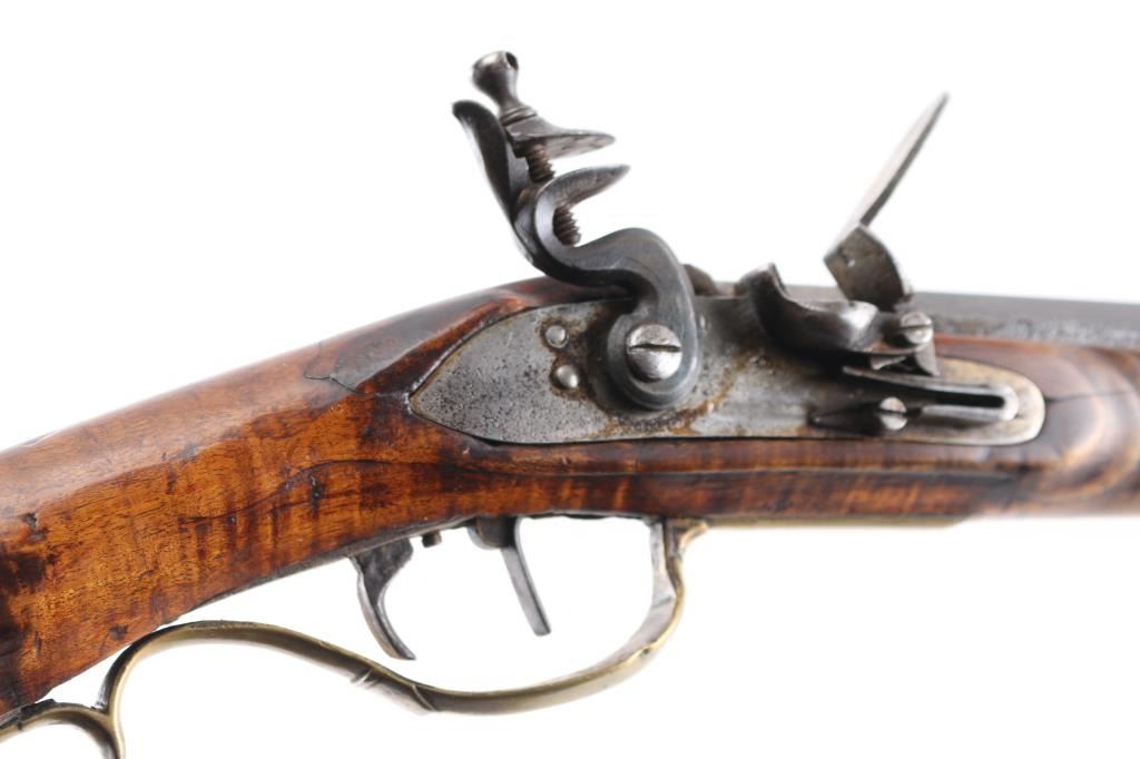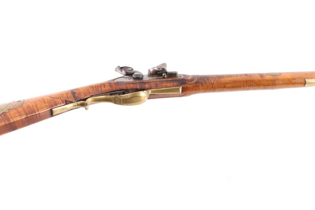w/ raised carved stock and side plate. Secured by 2 large screws and small. Engraved and pierced patchbox. Silver and brass inlays and escutcheons. The lock is a re-conversion back to flint from percussion and the rifle reduced 4"-8" in its working life 56-1/2" overall and 41-1/2" BBL. Approx. 36 cal. rifled bore. The butt is fairly fat, measures about 1-1/4" across the widest part of top. The stock has been refinished and shows some repair and restoration. There is a dark line around the wrist area, but does not seem to have been broken through (fill to hide crack or what I can not discern) The carving is still fairly well defined. Larry Shelton famous California author, collector and rifle enthusiast estate. Worth proper restoration.