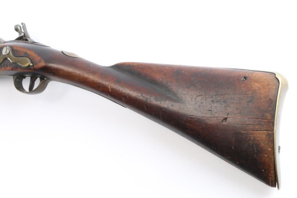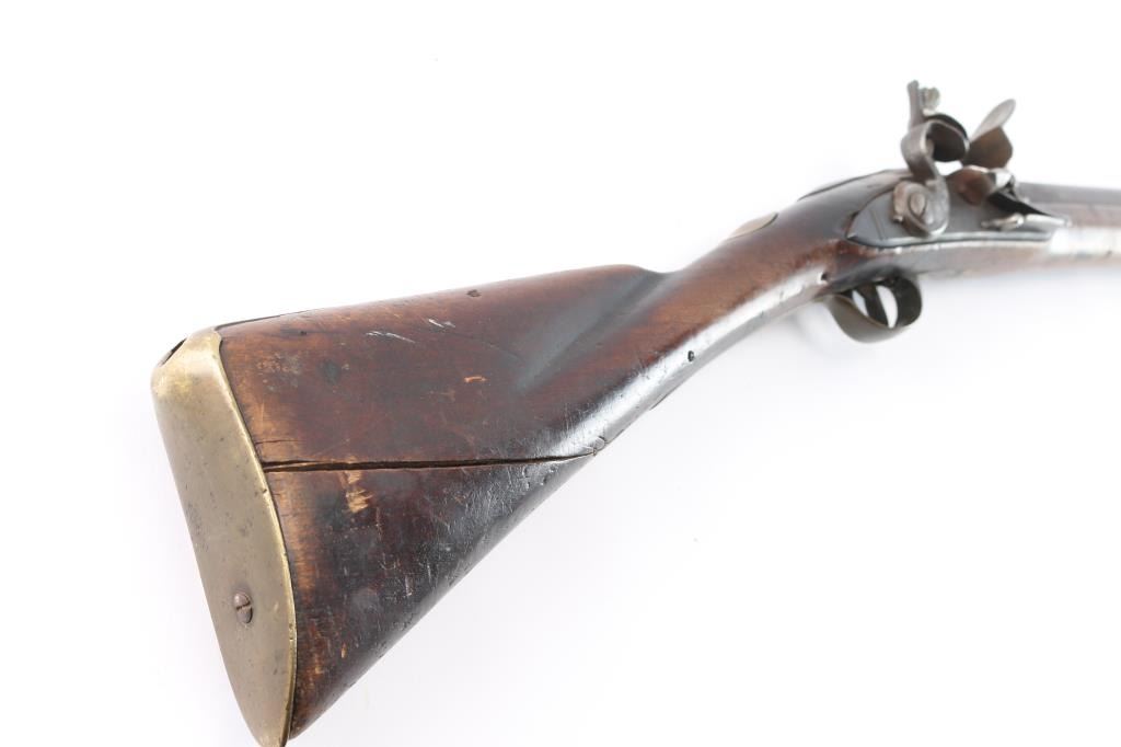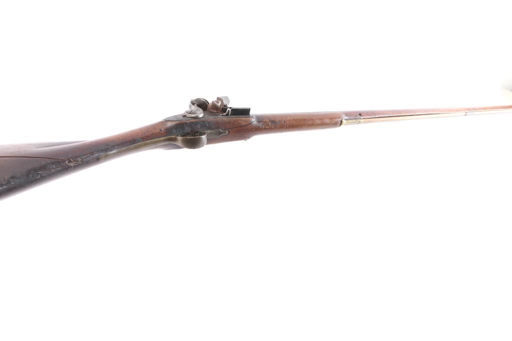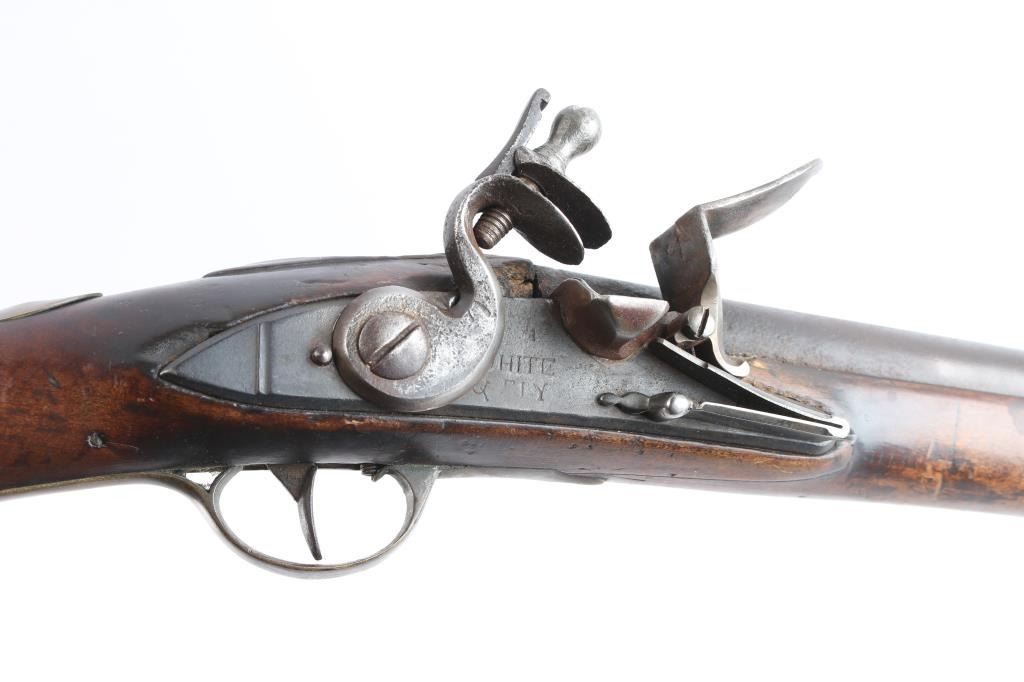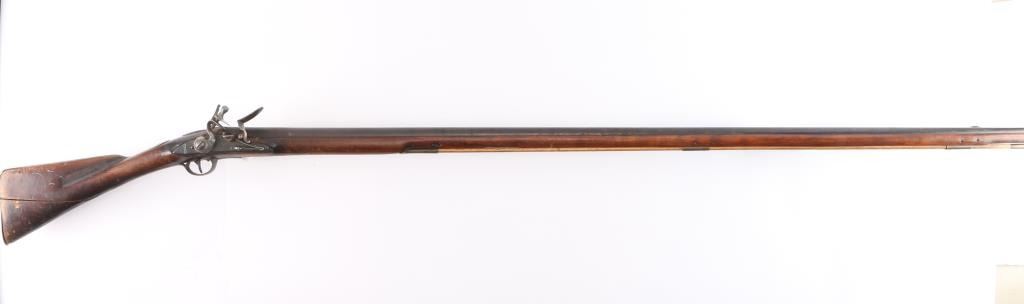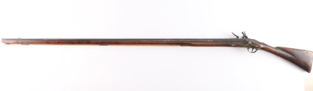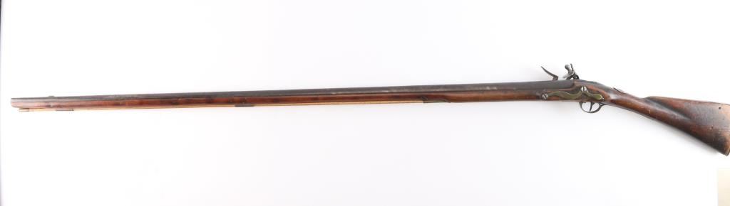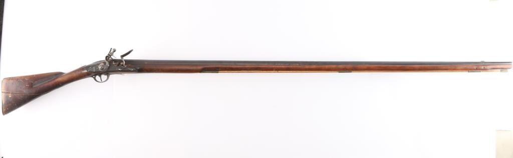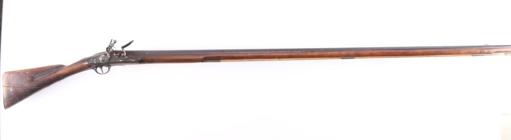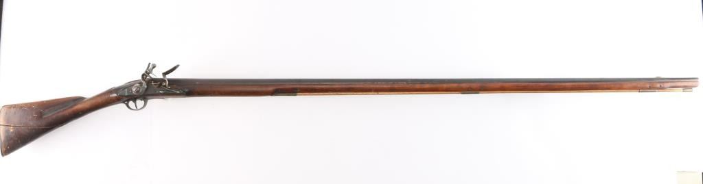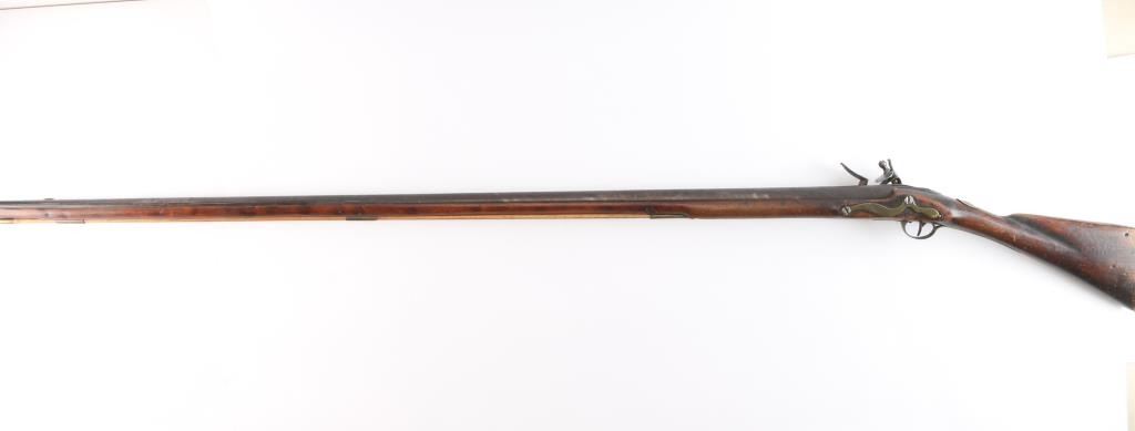 Signed White & Fly on the lock, revolutionary war era styling. Our consignor's notes indicated Virginia made and purchased from David Condor Inc. in early 1990's. Measures 69" overall with 53 1/2" bbl of approximately 60 plus cal smoothbore. Lazy "S" shaped side plate with plain brass military style mounts and sheet brass ramrod thimbles. Original Flintlock condition with correct parts. The stock has been restored from the rear ramrod thimble forward by splicing in new wood (well done by professional restorer). The remainder of the stock is in fair original condition with large crack on right side, small chips missing around the lock from firing at back top shoulder and other normal defects and wear from use. The metal shows a dark black to brown patina and good honey color brass patina. The top screw hole is worn through into butt with large opening where screw is missing. Note: We found a maker named Nicholas White in Fredrickstown, Maryland - of the correct era, but no listing for White and Fly in American Gunsmiths by Frank M. Sellers. An interesting American gun, circa 1750-1780, in our opinion.
