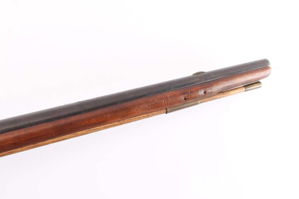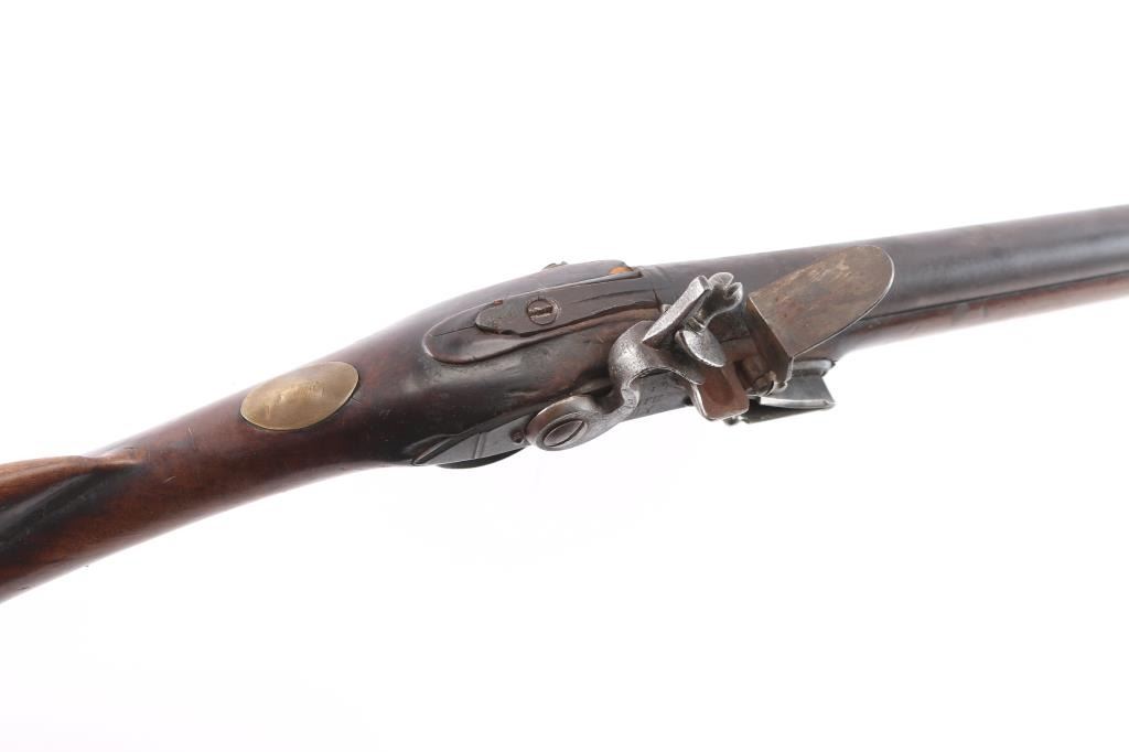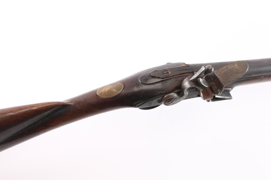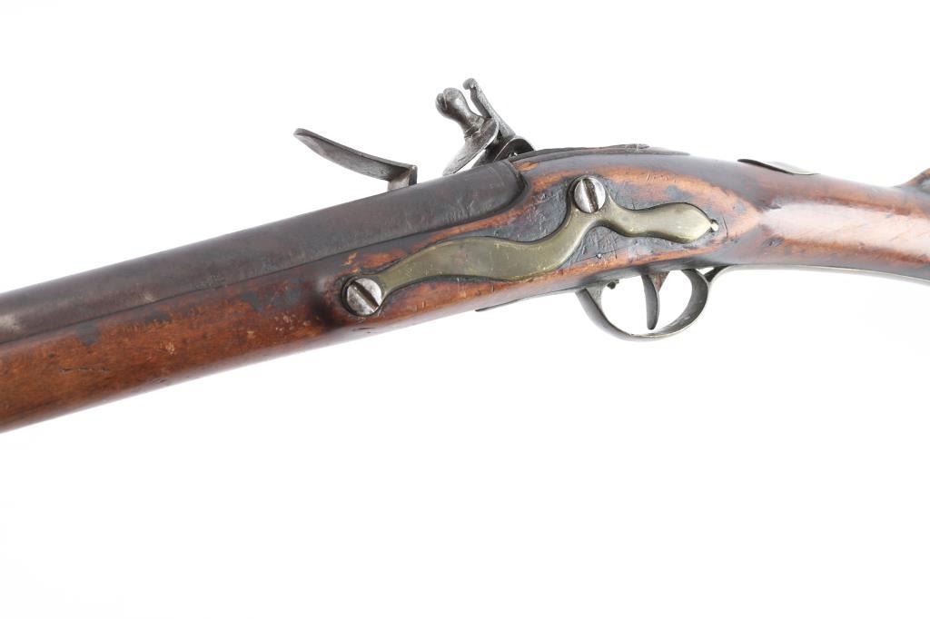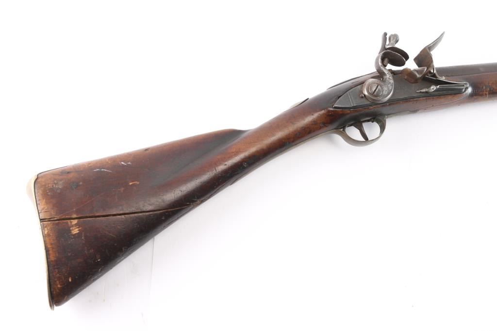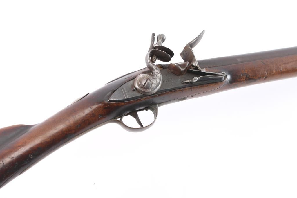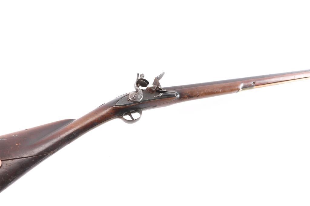 Signed White & Fly on the lock, revolutionary war era styling. Our consignor's notes indicated Virginia made and purchased from David Condor Inc. in early 1990's. Measures 69" overall with 53 1/2" bbl of approximately 60 plus cal smoothbore. Lazy "S" shaped side plate with plain brass military style mounts and sheet brass ramrod thimbles. Original Flintlock condition with correct parts. The stock has been restored from the rear ramrod thimble forward by splicing in new wood (well done by professional restorer). The remainder of the stock is in fair original condition with large crack on right side, small chips missing around the lock from firing at back top shoulder and other normal defects and wear from use. The metal shows a dark black to brown patina and good honey color brass patina. The top screw hole is worn through into butt with large opening where screw is missing. Note: We found a maker named Nicholas White in Fredrickstown, Maryland - of the correct era, but no listing for White and Fly in American Gunsmiths by Frank M. Sellers. An interesting American gun, circa 1750-1780, in our opinion.