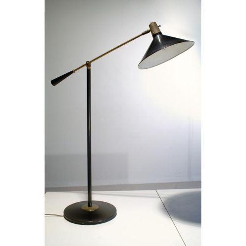 Base 40 inches, arms 31 inches, shade 14 inches diameter, painted metal, brass, bakelite, in original vintage good condition