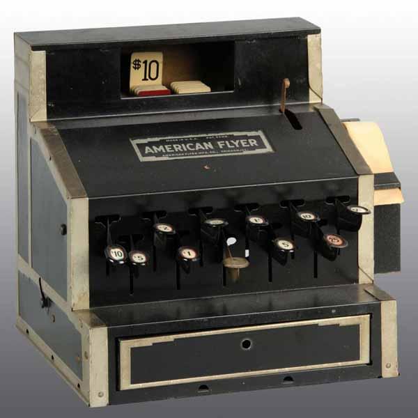 Description Scarce. Appears to be in working condition. Plate on front reads "American Flyer Manufacturing Company Chicago, Illinois". Very little wear. Includes original key and coins. Condition (Excellent). Size 9" x 9".
