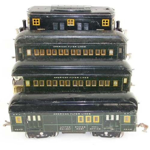 American Flyer Set, 4000 Green Electric Locomotive, 4040 Baggage Car, Pleasant View Pullman & Observation Car, Condition: lots of scratches, engine missing pantographs & lights