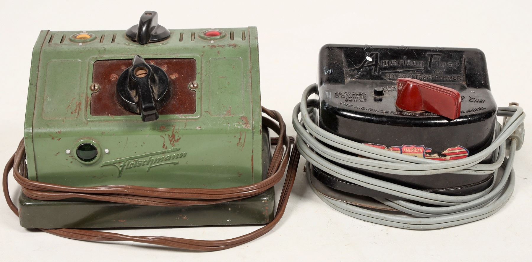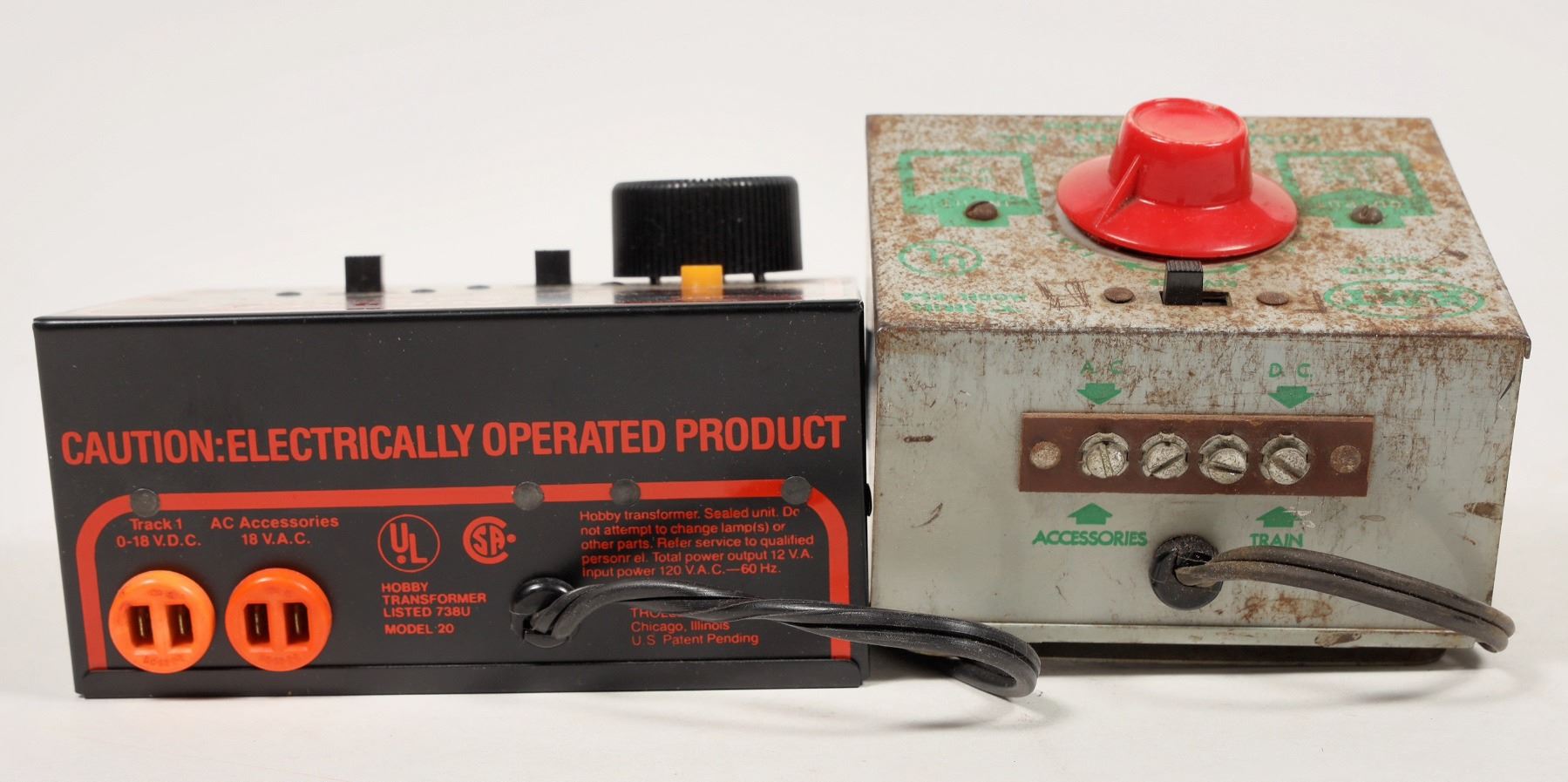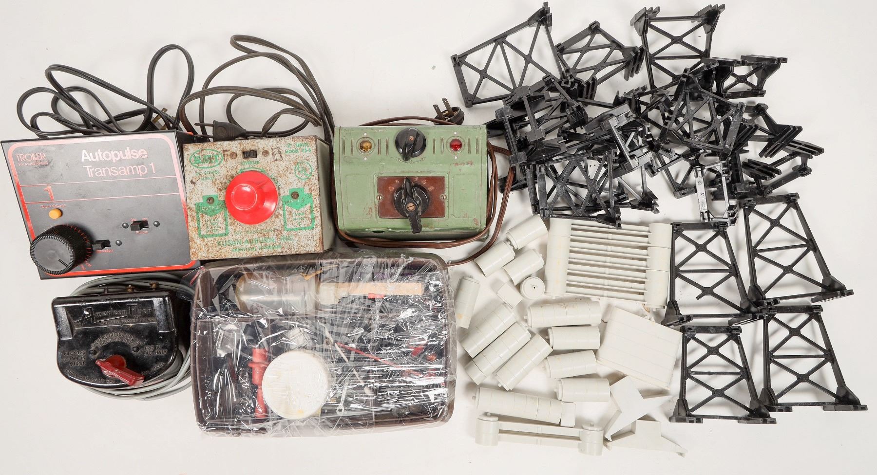 Lot of 7+. Four working transformers: one is American Flyer, one is AutoPulse and two others. One trestle bridge (unk if complete. One caddy of misc. screw, nuts, Trucks, Truck wheels, Loco drive wheel linkage, gear grease and oiler.