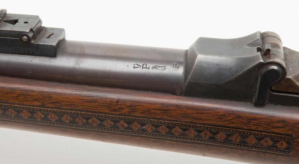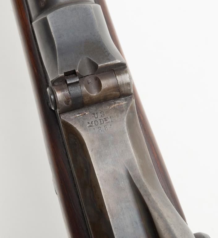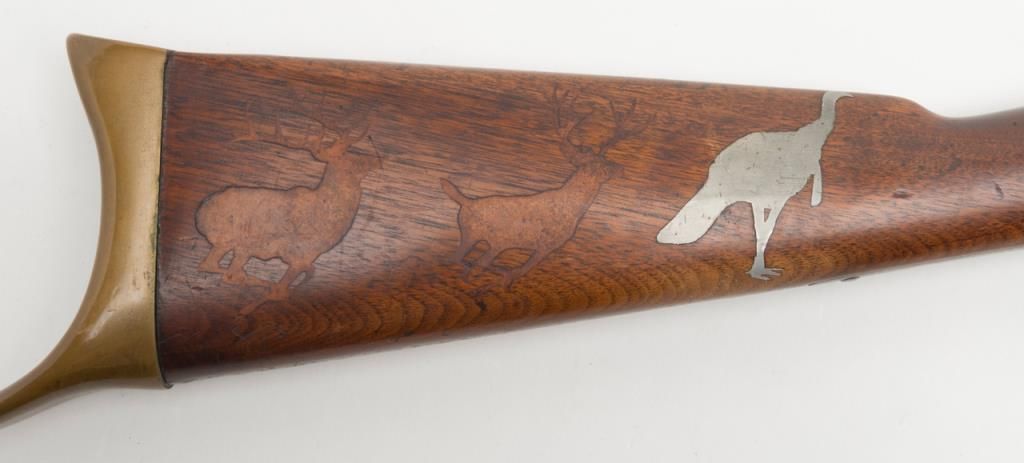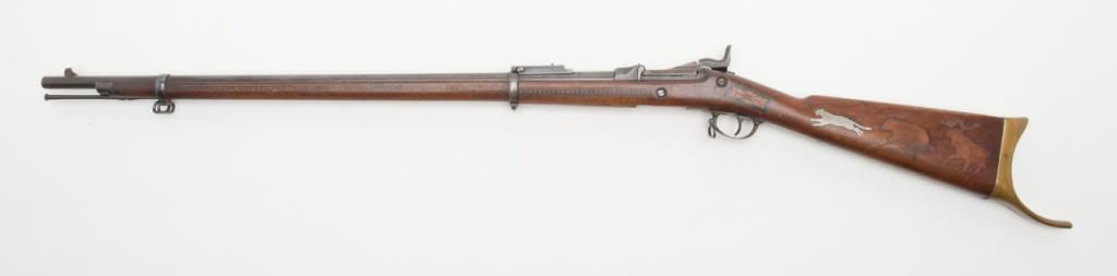American Folk art decorated and inlaid Springfield trapdoor rifle in .45-70 caliber, serial number 476584. The name Adolph Steinholl is carved in the comb. This rifle shows Germanic influences and cast brass Swiss buttplate.. In near finecondition. Est.: $500-$1000