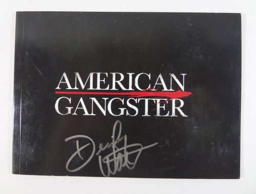 7 1/2" x 5 1/2" paperback - explaining making of movie--including some nice photo's in paperback. Front cover of American Gangster book signed by Denzel Washington with silver sharpie. No COA. Est. Value $225.00 - $325.00.