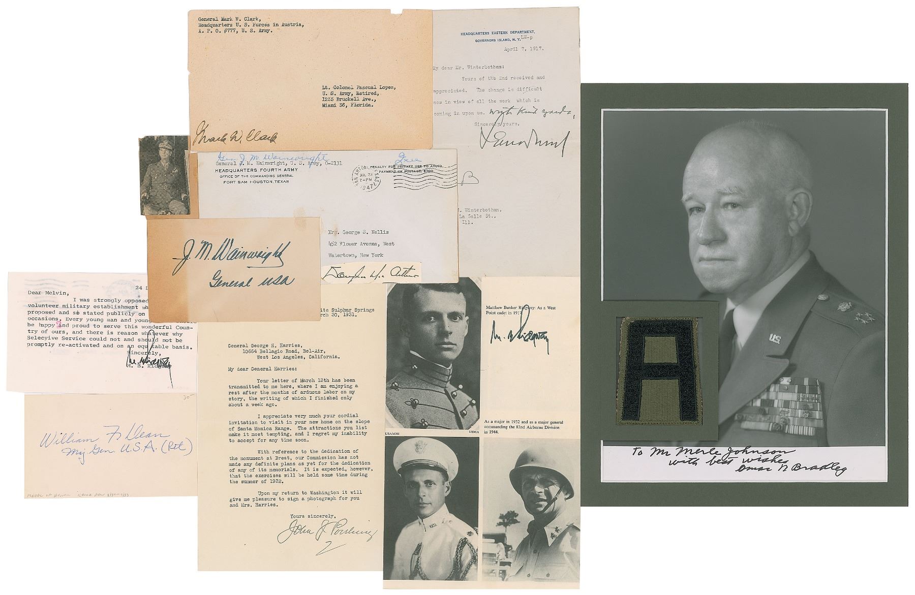 Group lot of nine items signed by an acclaimed American General, ranging in size from 3 x .75 to 8 x 10, with signers including: Omar Bradley (ISP, matted), Mark W. Clark (envelope), William F. Dean (card), Douglas MacArthur (slip), John J. Pershing (TLS), Matthew Ridgway (2; TLS and book photo), Jonathan M. Wainwright (card, with affixed envelope and clipping), and Leonard Wood (TLS). In overall very good to fine condition. Accompanied by a 'General Pershing' calling card annotated by another hand, a pamphlet entitled 'General Douglas MacArthur Speaks to Congress,' an invitation from Mark W. Clark for a 'reception in honor of the Committee on Atomic Energy,' the mailing envelope for the Wood letter, and a modern photo of Dean bearing a signature inherent to photo.