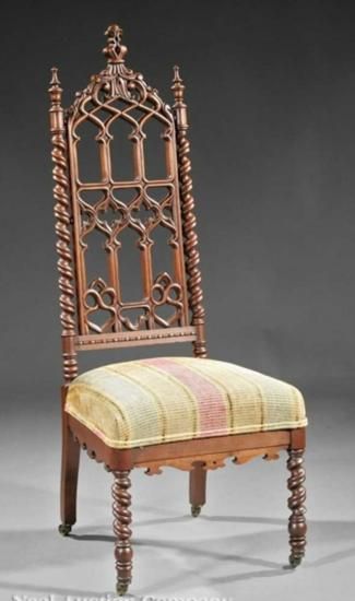 An American Gothic Carved Walnut Hall Chair, mid-19th c., crocketed crest, tracery back, barley twist stiles, shaped seat rail, barley twist legs, casters