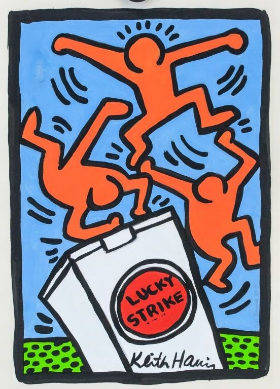 Gouache on paper. Featuring three figures jumping wildly around a podium with "LUCKY STRIKE" on it. Signed "Keith Haring" at the bottom of the image. Stamped with "AUTHORIZED BY THE ESTATE OF KEITH HARING" on verso. 30 x 21 cm (11.75 x 8.3 in).