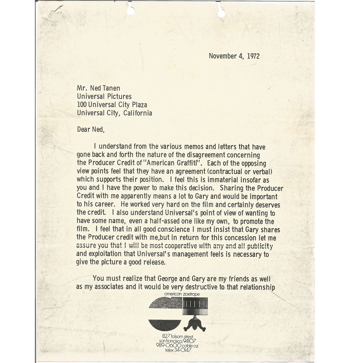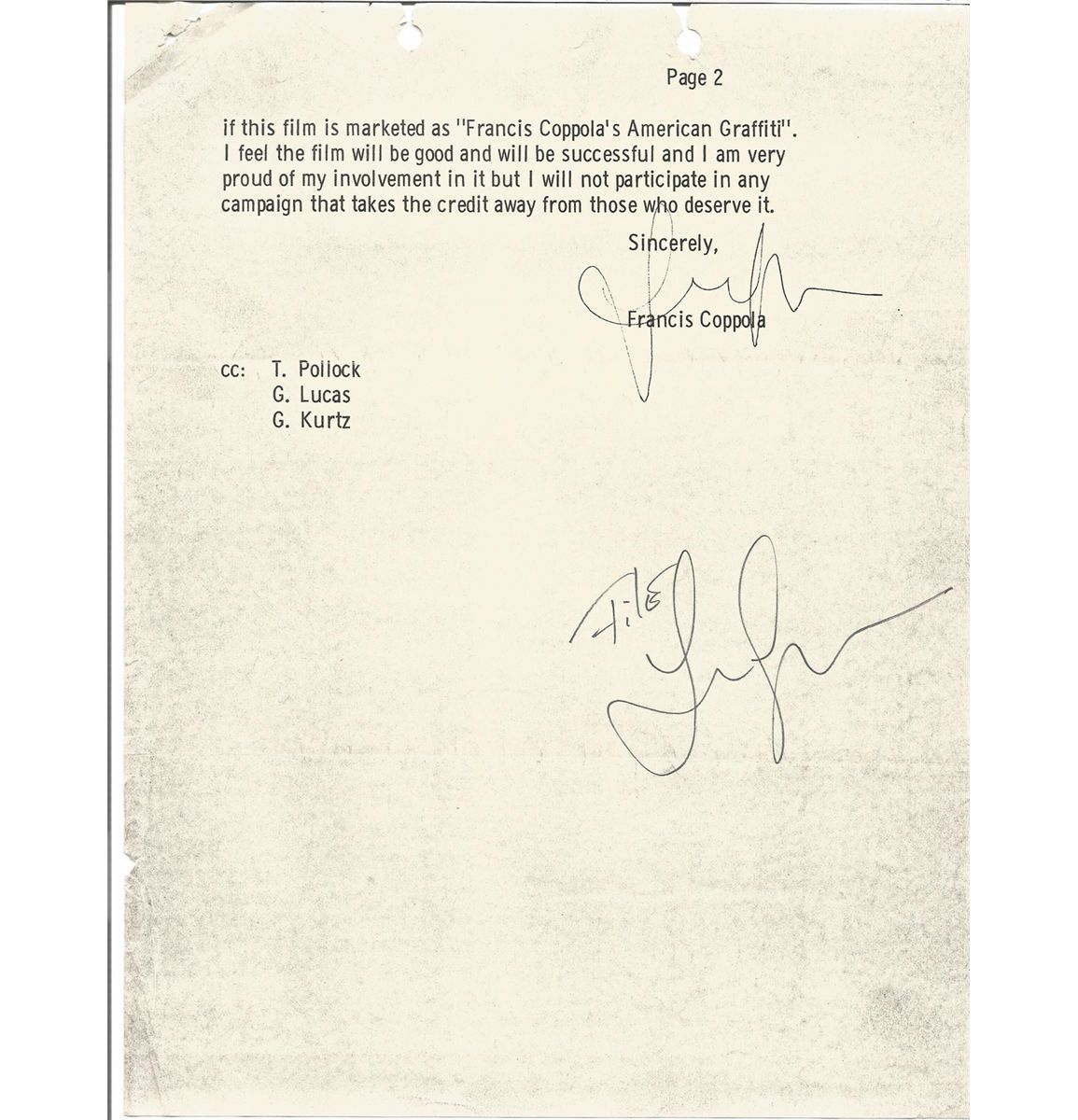A two page faxed document that is unpublished mentioning strife over who would take producer credits on the film American Graffiti – Francis Ford Coppolla is writing it to Universal and states he is friends with George Lucas and Gary Kurtz (who would late