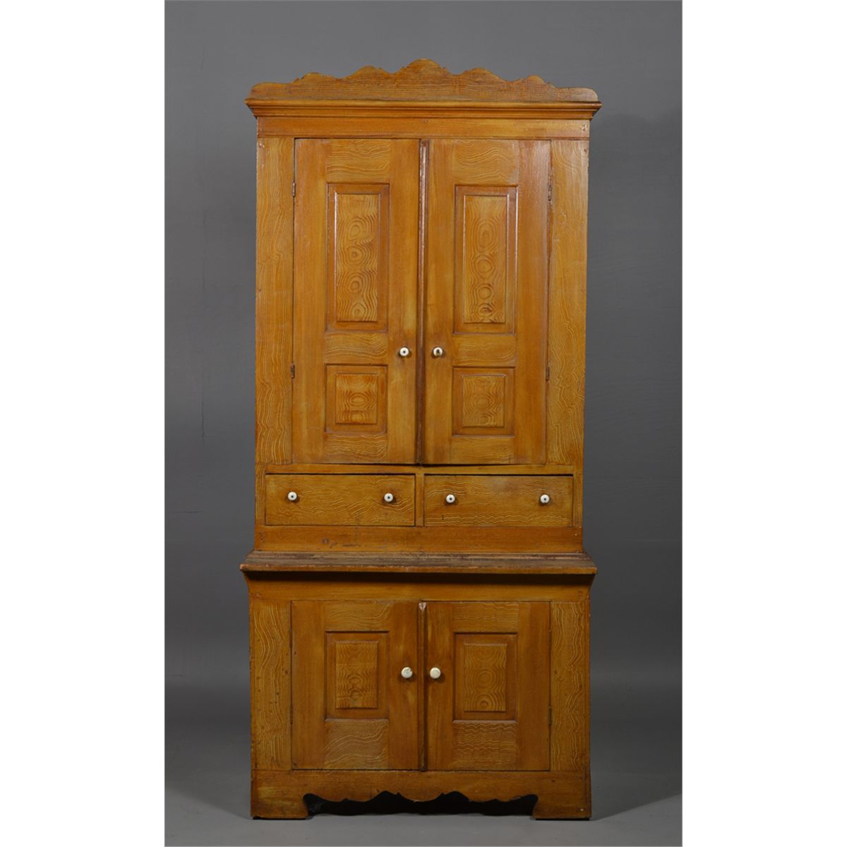 A fine American step back two piece cupboard, with two doors opening to reveal a shelved interior over two drawers with porcelain pulls, over two doors to the base opening to a shelved interior.  The doors and sides with recessed and raised panels, with shaped cornice and scalloped apron. Retains its' original vibrant grain paint decoration and original hardware.  77.25" H x 40.5" W x 20" D.  Circa 19th century.  Private collection Gregory, MI.
