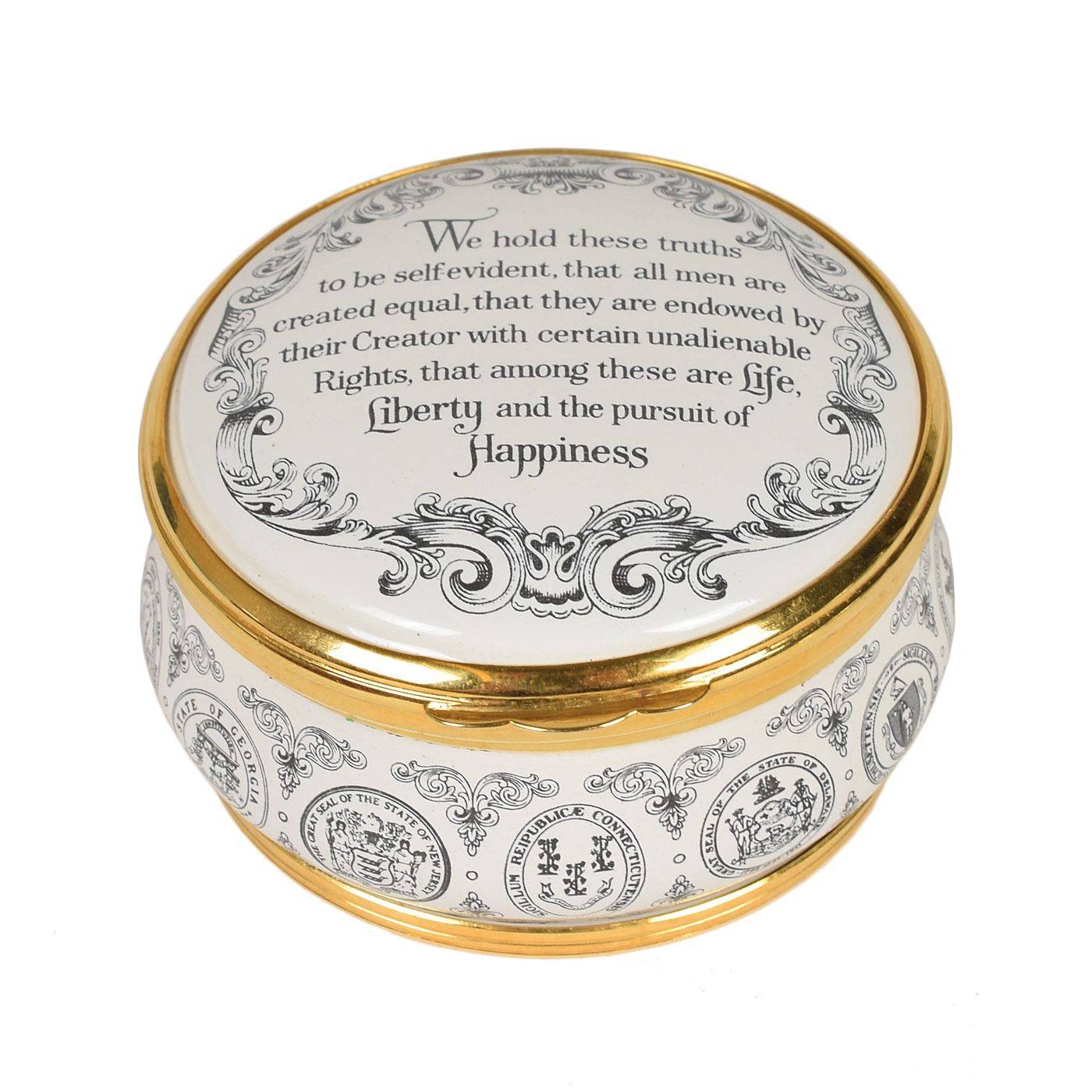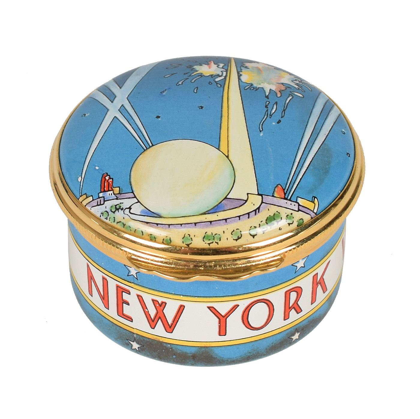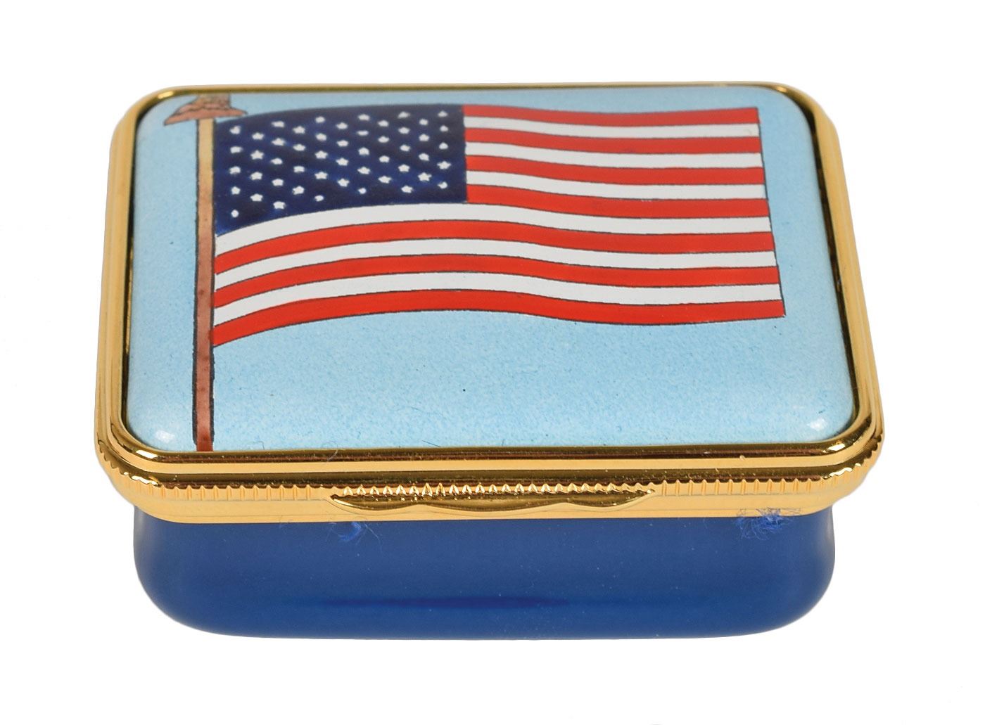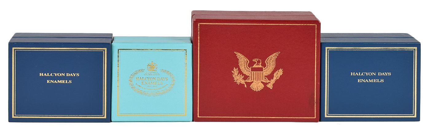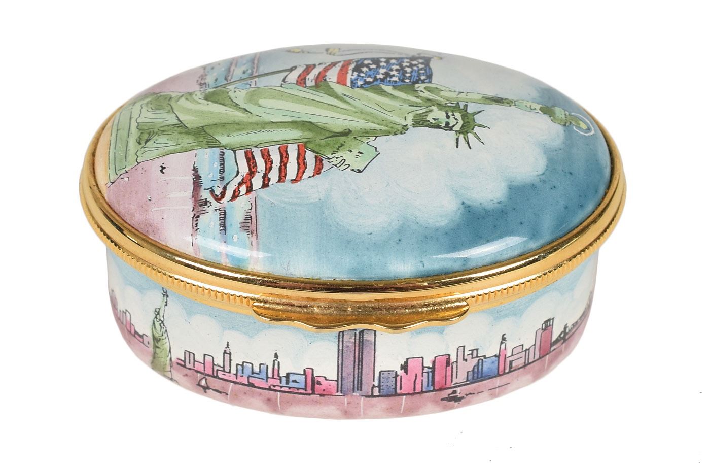 Group of four small enameled boxes honoring American history, including: a circular Bilston enamel trinket box by Cartier celebrating the bicentenary of the Declaration of Independence, measuring 2.5? in diameter and 1.25? tall; a circular enameled pill box by Halcyon Days of Bilston, England, honoring the 1939 World's Fair in New York, measuring 1.5? in diameter and 1? tall; an enameled trinket box honoring the Statue of Liberty, designed by Tiffany & Co. and made by Halcyon Days, measuring 2? x 1.5? x 1?; and a trinket box made by Halcyon Days, measuring 2? x 1.5? x .75?, depicting the American flag to honor September 11th. In overall fine condition. Accompanied by their original boxes.